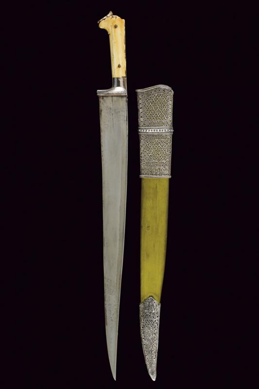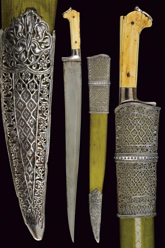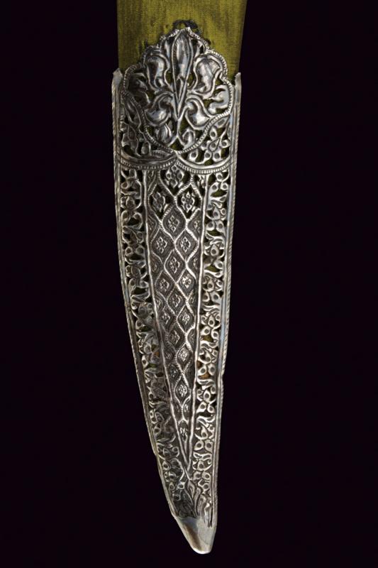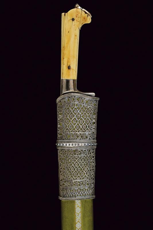 Bel coltello khyber, datazione: Fine del XIX Secolo provenienza: Afganistan, Larga lama a un filo probabilmente in damasco con dorso a 'T'. Impugnatura in argento liscio con guancette in avorio, bottone con pendente traforato in argento. Fodero in legno rivestito di seta verde con due fornimenti in argento riccamente incisi e traforati. lunghezza 63.5 cm.