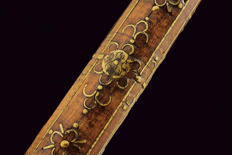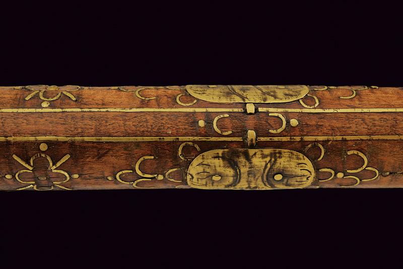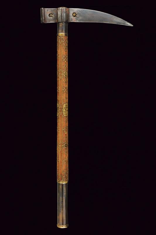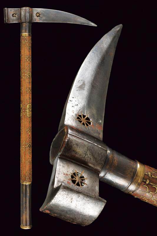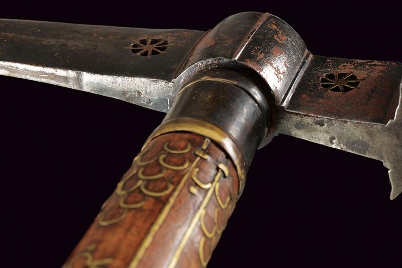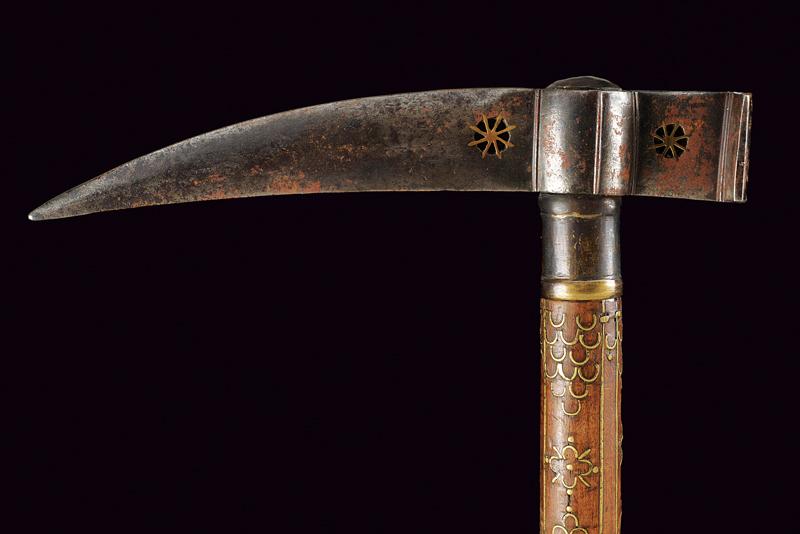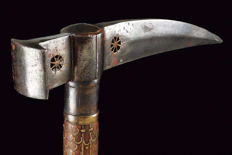 Raro martello d'arme, datazione: XVIII Secolo provenienza: Indopersia, Testa in ferro con bocca quadra leggermente convessa, munita di sforatura circolare al collo ornata con raggiera in ottone, il blocchetto con nervature verticali, il becco di sezione rettangolare a facce leggermente convesse, anche questo con sforatura circolare ornata con raggi in ottone, di forma incurvata verso il basso. Al dorso una placca in ottone.Fusto cilindrico in legno, la ghiera in ottone (di restauro?), la superficie del fusto decorata con agemine in ottone lavorate a motivi floreali, a bande e squame. L'impugnatura cilindrica in ottone liscio (di restauro?). Rara tipologia. altezza 54,5 cm.