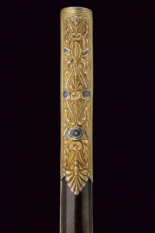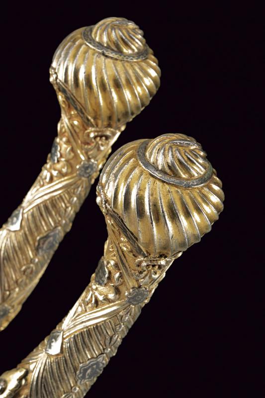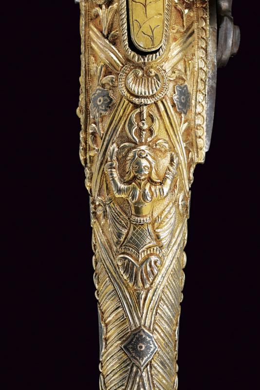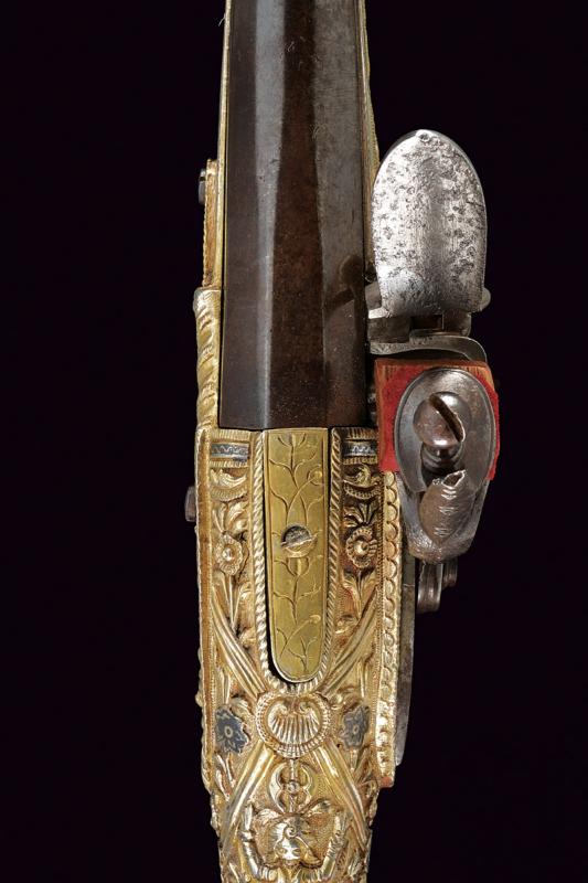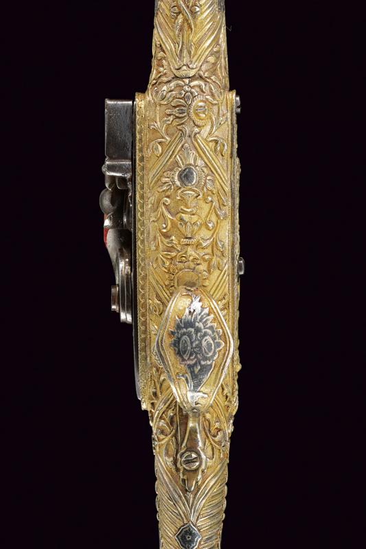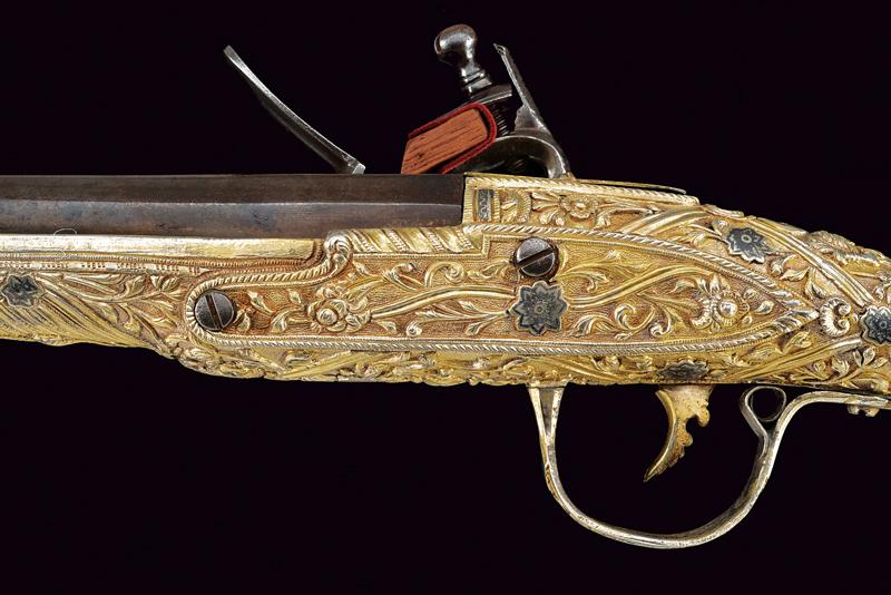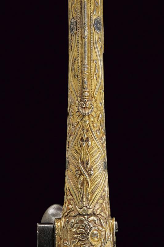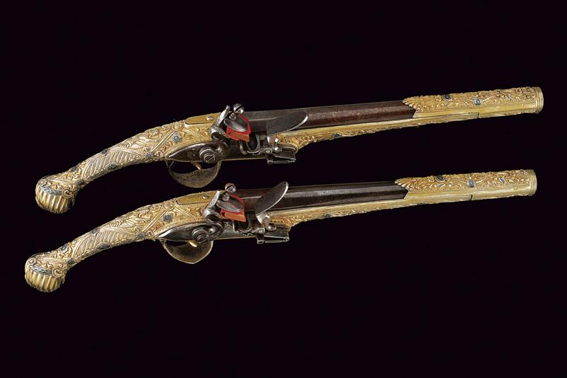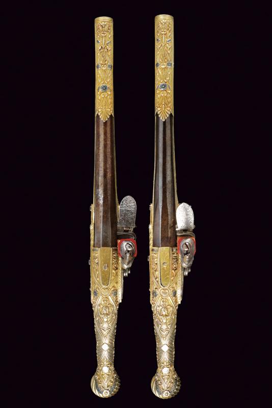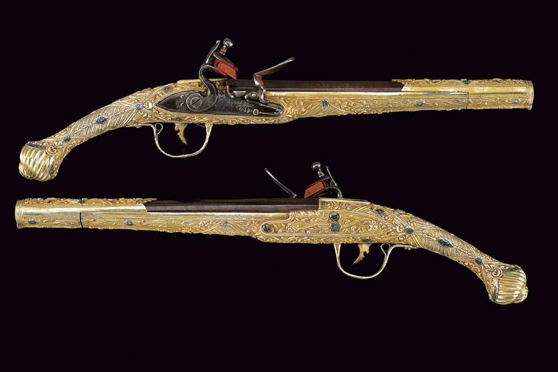 Eccezionale paio di pistole a pietra focaia in argento dorato, datazione: primo quarto del XIX Sec. provenienza: Turchia, Canne lisce in ferro, tonde e con culatta ottagonale, recanti resti di antica finitura, cal. 16 mm. Codoli laminati in argento dorato. Batterie alla moderna con cartella piatta, delineate e con piccole incisioni. Cani a collo di cigno lavorati en suite. Meccaniche funzionanti. Raffinate casse in argento dorato, in ottimo stato di conservazione. La superficie riccamente lavorata a motivi floreali in rilievo su fondo a granuli e tempestata di fiori disegnati a niello. Nella parte inferiore un grande vaso culminante in un fiore niellato, in vari punti conchiglie in rilievo. Al dorso effige di un personaggio con capo coperto da turbante e sormontato da scure bipenne. Le impugnature lavorate a bande tortili. Le cocce a turbante. Ponticelli sempre in argento con composizione di fiori niellati. Le tipiche bacchette finte tutte scolpite e ricche di piccoli elementi decorativi. Sui lunghi reggicanna in argento proseguono perfettamente i disegni presenti nella parte anteriore della cassa. Rare pistole sia per l'alta qualità dei fornimenti, sia per l'ottimo stato di conservazione. lunghezza 47 cm.