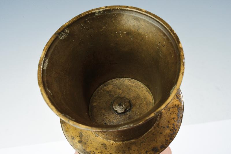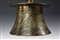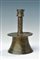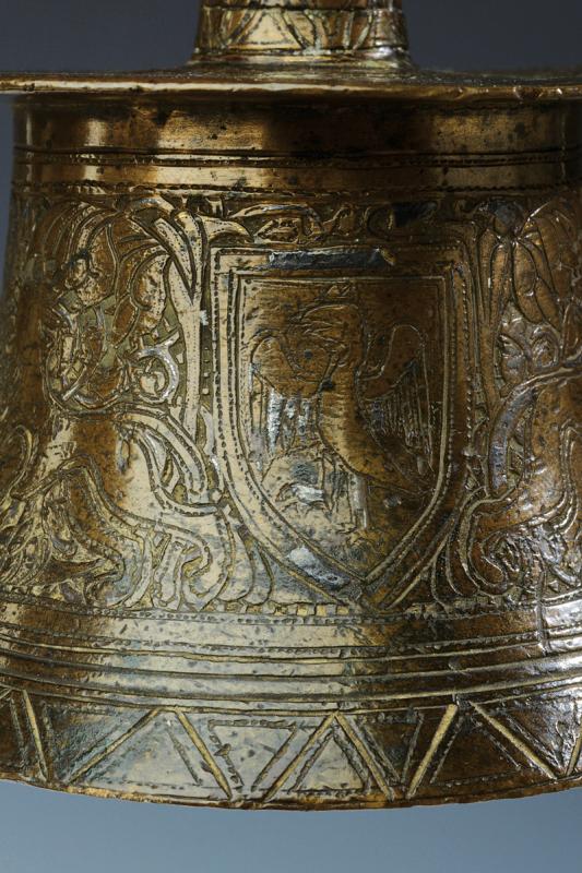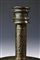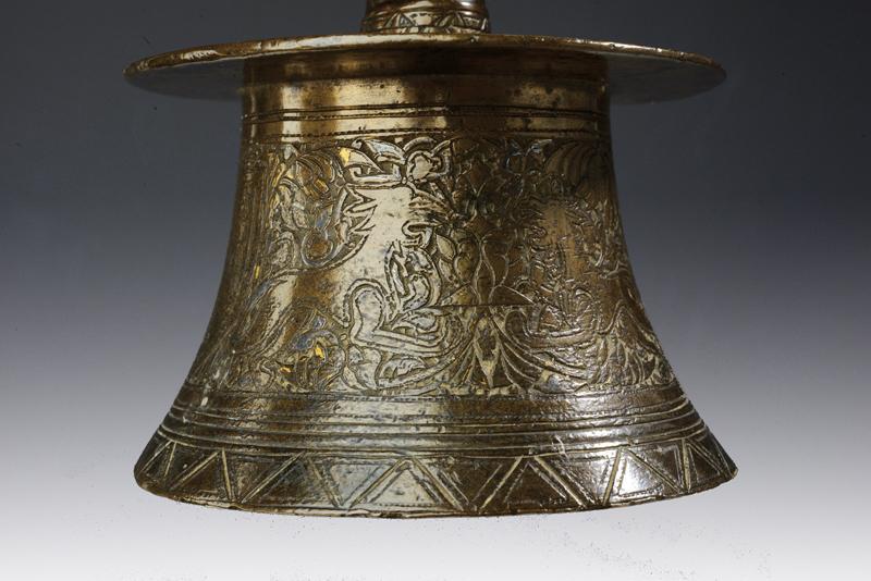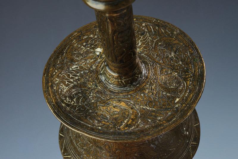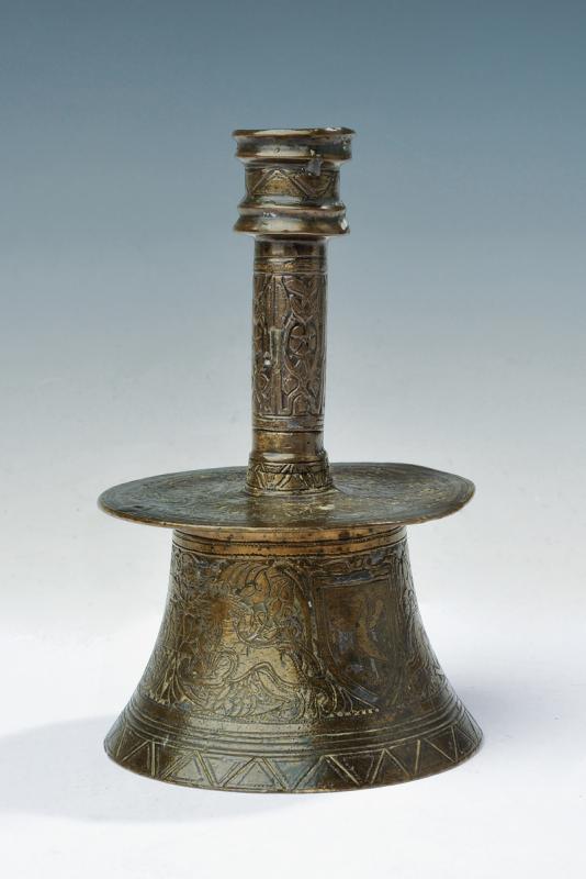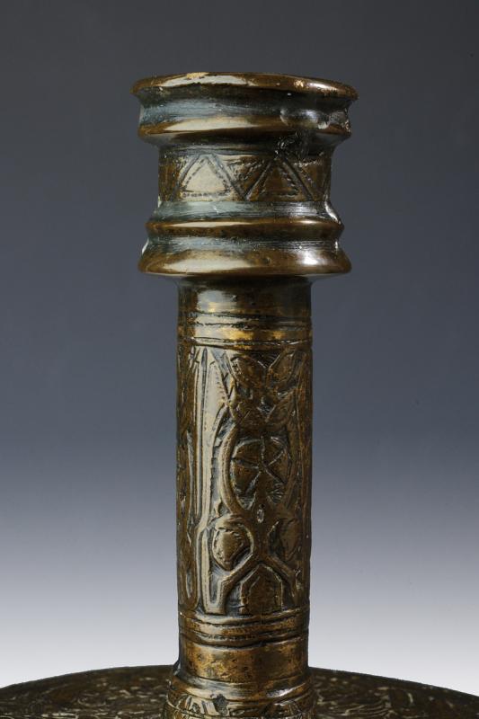 Candelabro in bronzo inciso, datazione: provenienza: Siria, In bronzo. La parte bassa lavorata a campana, il centro a disco piatto, la parte superiore a fusto cilindrico con estremità allargata per ospitare la candela. La superficie finemente incisa, la base con due scudi araldici recante un aquila, tra di loro due animali del bosco che si guardano fra decorazioni floreali, il bordo inferiore con banda di triangoli. Il piatto ed il fusto inciso a motivi floreali, tra gli anelli della sommità si ripete il disegno con i triangoli. Mentre gli scudetti conservano resti di argentatura si trovano tracce di doratura negli spazi intermedi. Il candelabro è lavorato in due pezzi uniti da un solo grande rivetto al centro dentro la cupola. Vedi un candelabro simile nella collezione del British Museum, Museum number1855, 1201.6 altezza 15 cm.