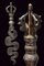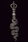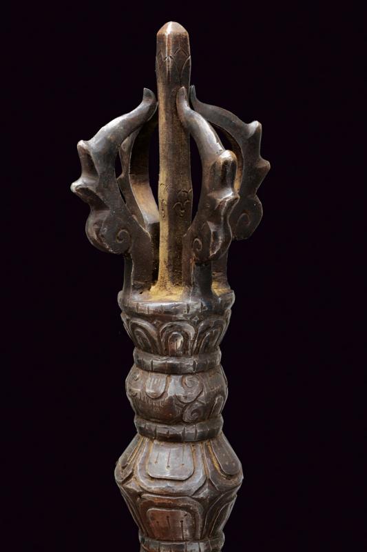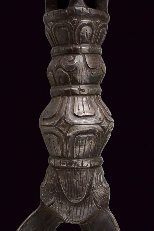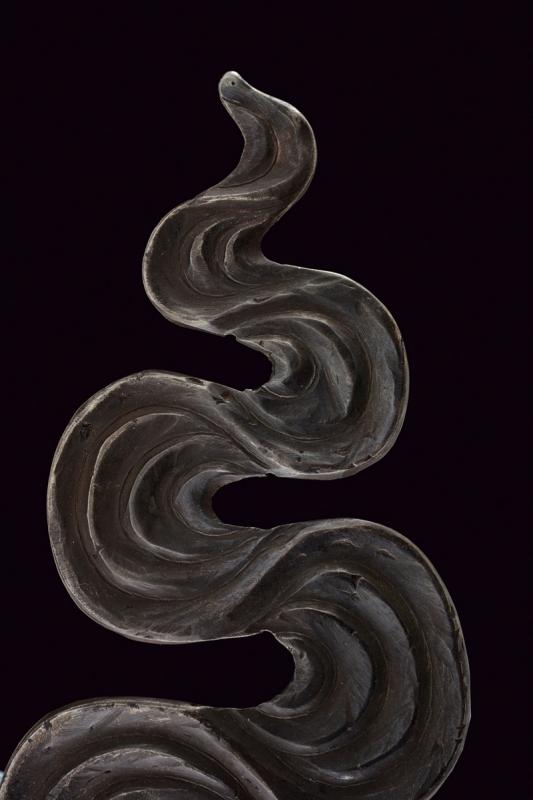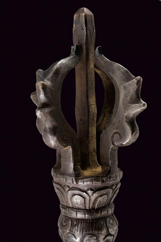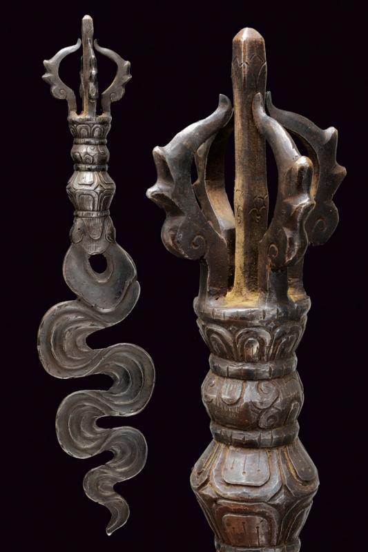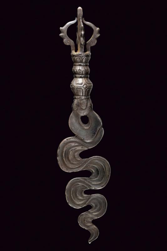 Spada vajra di fuoco, datazione: provenienza: Tibet, Interamente in ferro. Lama priva di fili e punta. Di forma fortemente ondulata, ben lavorata a imitare una fiamma. L'impugnatura ornata a nodi con superficie lavorata ad intaglio a motivi floreali e geometrici. Il pomo lavorato a grande vajra messo a giorno. Rara in dimensioni così grandi. La spada vajra (ray khri in tibetano, khadga in sanscrito) è una dei due simboli principali di Manjushri, il buddha trascendente della saggezza. Originariamente era uno strumento di morte, ma poi la spada vajra ha iniziato a simboleggiare la capacità dei saggi di uccidere l'ignoranza, l'esistenza indipendente, che è alla base di tutte le emozioni negative. Questa grande e inusuale spada forse faceva parte originariamente di un gruppo statuario in Tibet o in Nepal. lunghezza 56,7 cm.