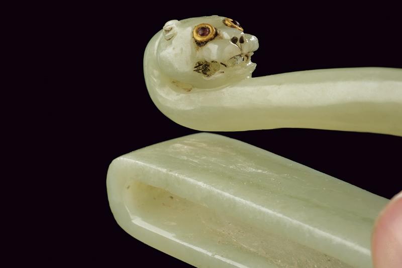 Rarissimo gancio da cintura per una spada in giada, datazione: XVIII Secolo provenienza: Cina, Intagliato in un unico blocco di giada, il gancio terminante in una testa di drago con occhi di rubino con bordo in oro. Passante per la cintura. XVIII secolo o prima. altezza 7.5 cm.