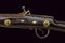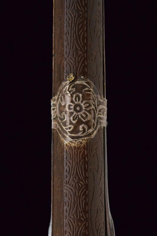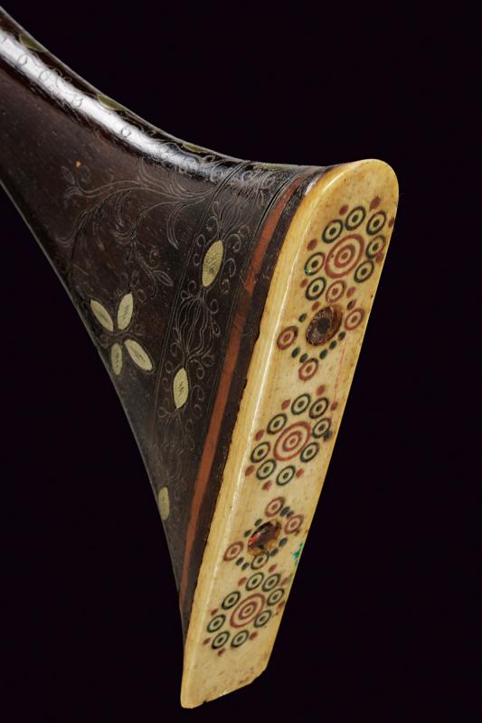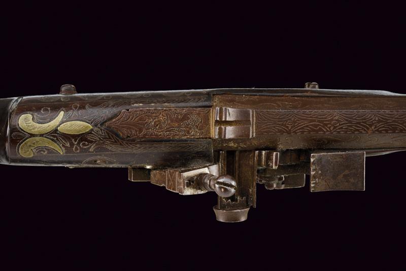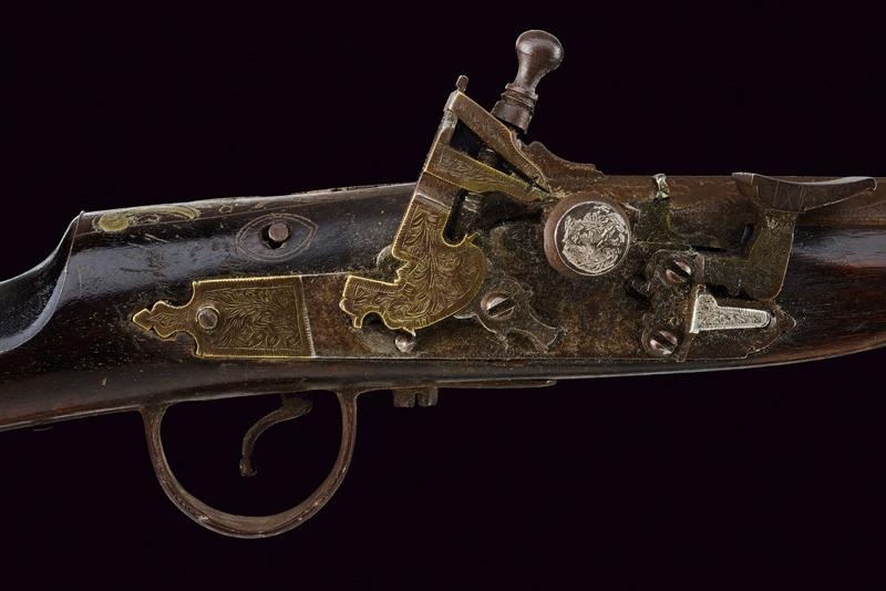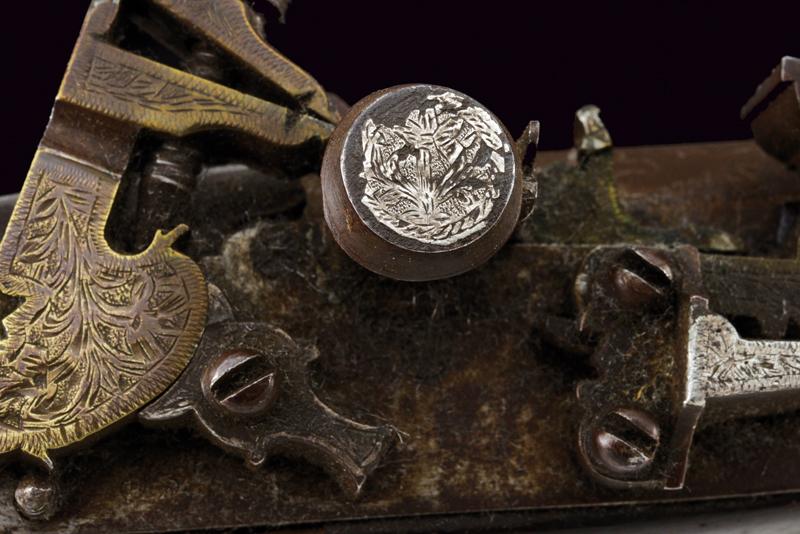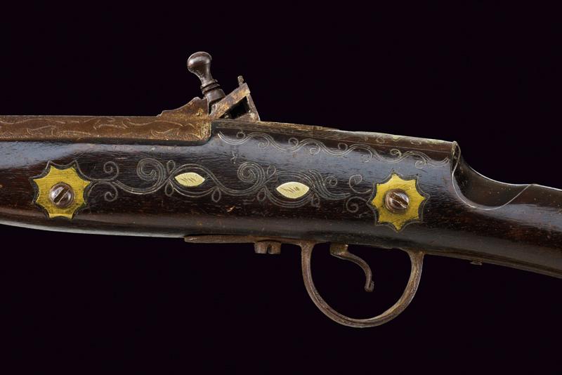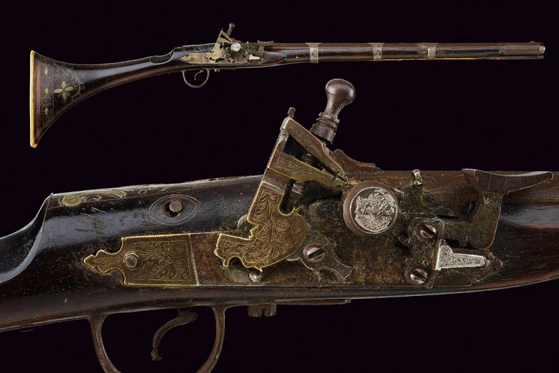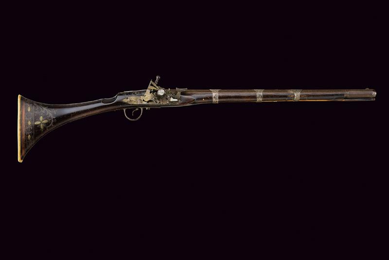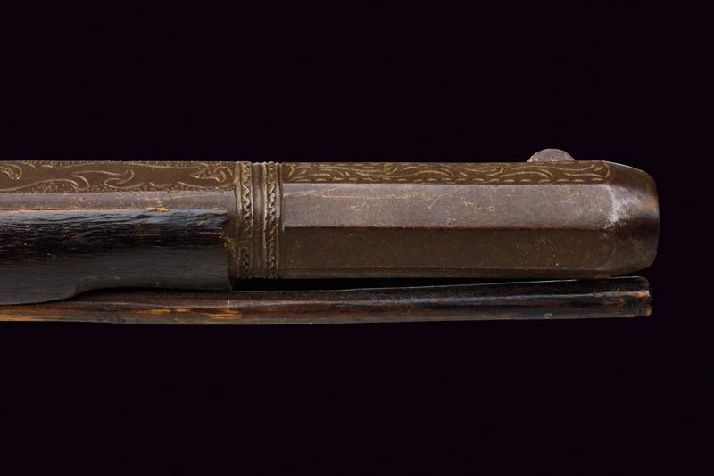 Raro Moukala a pietra focaia da ragazzo, datazione: Metà del XIX Secolo provenienza: Africa del Nord, Canna in ferro liscio, ottagonale, con alzo alla base e mirino, incisa su tutta la lunghezza, cal. 13 mm; codetta incisa; bella batteria a pietra focaia con decorato con placche incise in ottone ed argento. Cassa intera in legno decorato con intarsi a placche e in filigrana, la coccia in osso dipinto a cerchi rossi e verdi. Tre fasce reggicanna in lamina d'argento inciso. Bacchetta. In questa qualità sicuramente fatto per il figlio di un capo. lunghezza 81 cm.