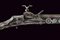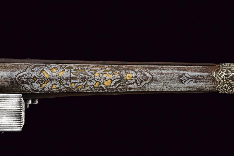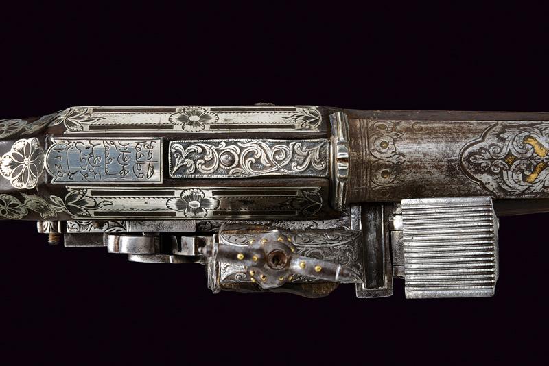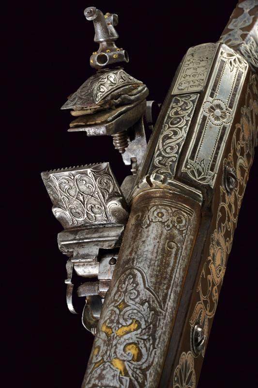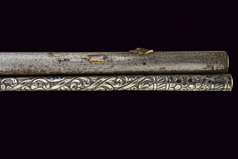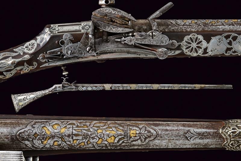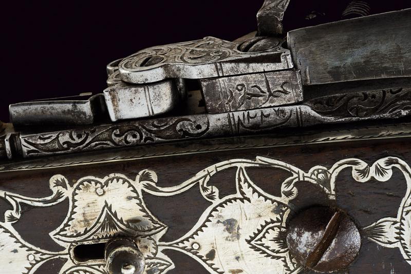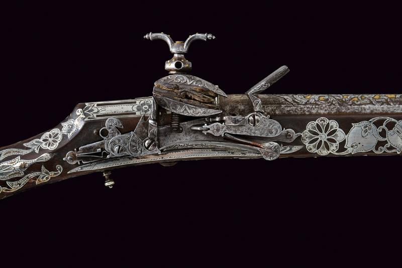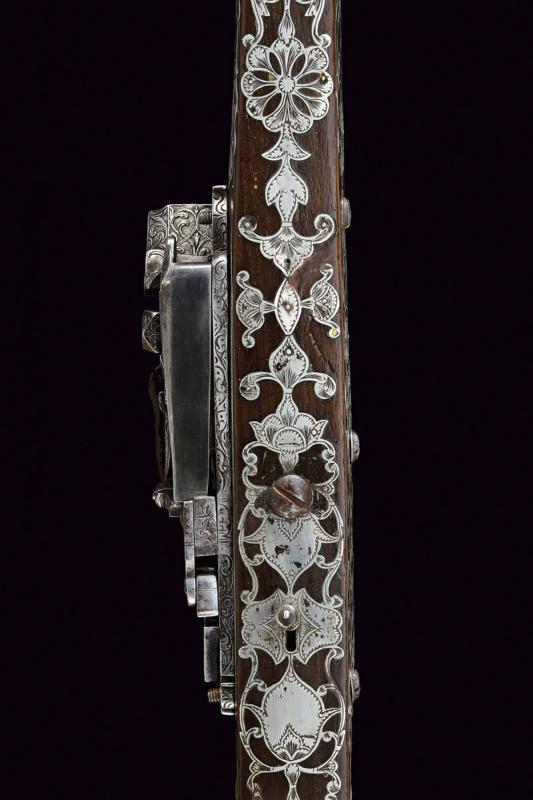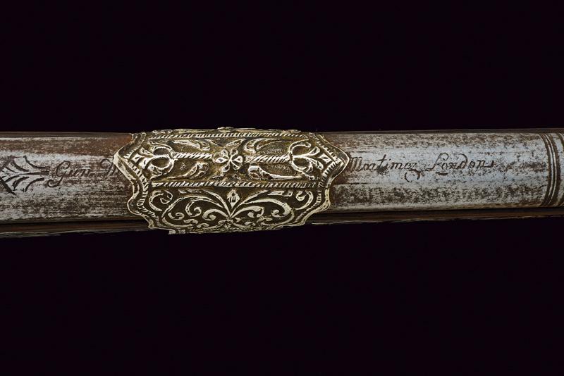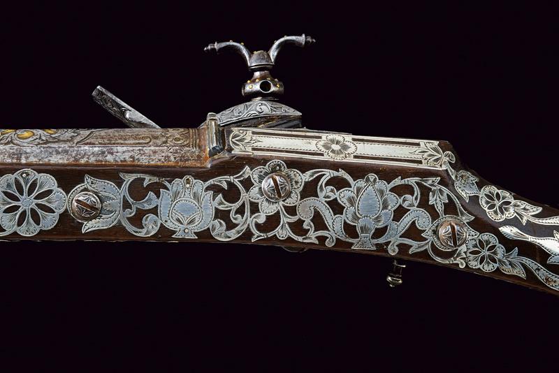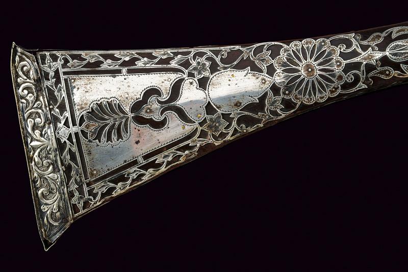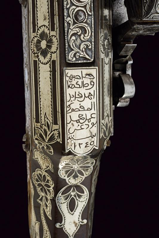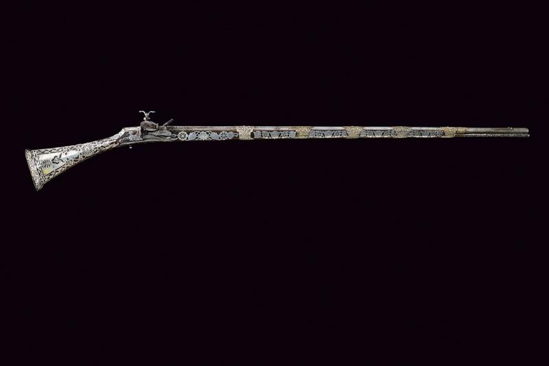 Bellissimo kabyle (fucile) a pietra decorato in argento, firmato e datato, datazione: 1829 provenienza: Algeria, Canna liscia a due ordini; ottagonale nella prima parte poi tonda e con bindella, dotata di mirino, recante marcatura 'Gun ... Mortimer London' (la parte centrale dell'iscrizione coperta da una fascetta), munita alla base di un cartiglio intagliato e inciso effigiante un personaggio armato di lancia fra cornici a foglie e su fondo con resti di doratura. Alla culatta il traguardo a cuspide. Il codolo rivestito in argento. Cal. 17 mm. Batteria a pietra incisa a racemi, firmata e datata '1227' (1812 nel calendraio gregoriano). Cassa intera in legno riccamente decorata con lamine in argento traforate e incise ad effigiare fiori. Al dorso, accanto al codolo della canna una placchetta in argento con firma e data 'Mohamed Budaesh 1245' (1829 nel calendario gregoriano). Cinque reggicanna in argento lavorati con fiori in rilievo. grilletto in ferro e argento lavorato a vaso. Calciolo in argento en suite con le fascette. Tutta la parte anteriore della bacchetta foderata in argento lavorato a fiorami, il fusto in legno. Il fondo con sforatura-cavastracci. Raro in questa qualità. lunghezza 174,5 cm.