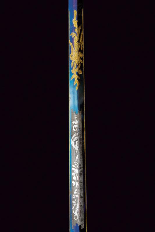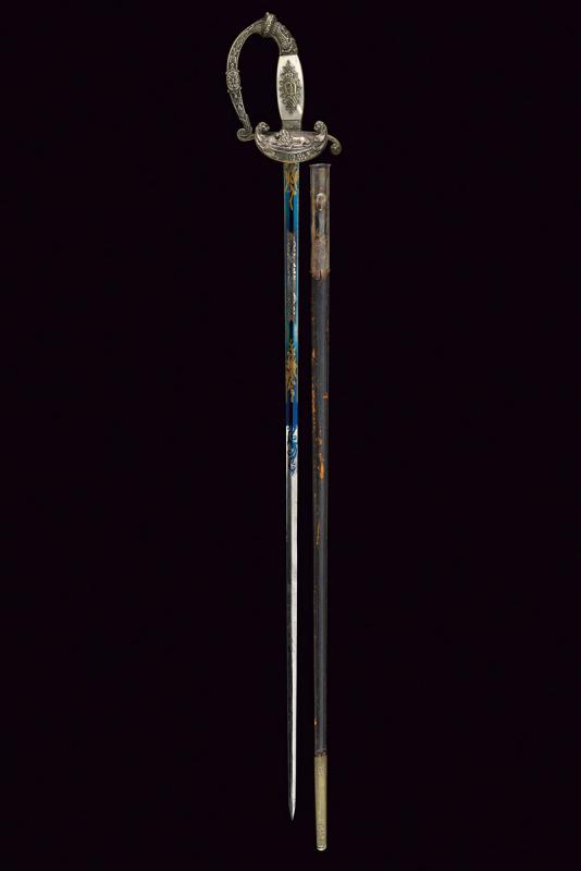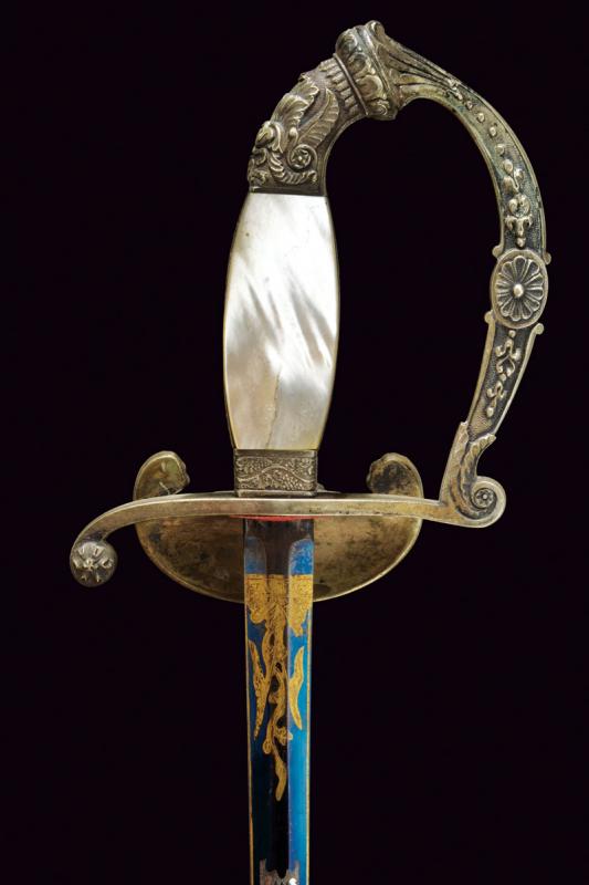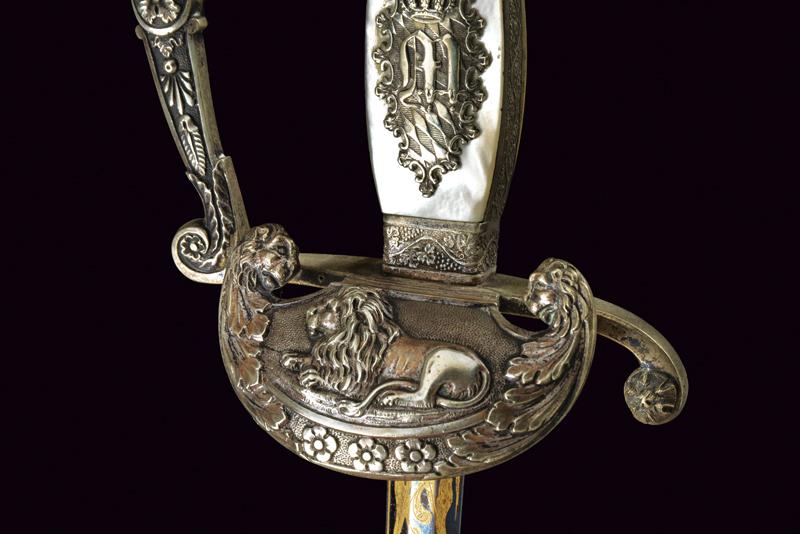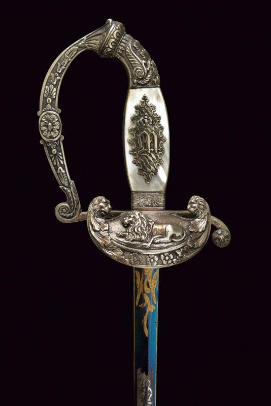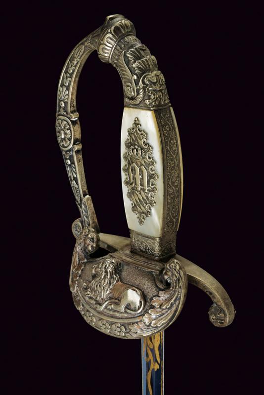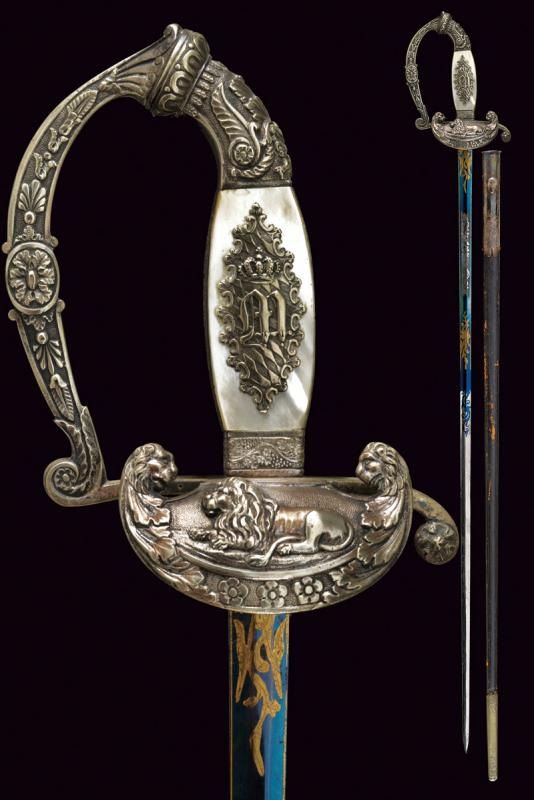 Bellissimo spadino da diplomatico dell'epoca di Re Massimiliano II di Baviera, datazione: metà del XIX Sec. provenienza: Baviera, Lama dritta a due fili di sezione esagonale, incisa e dorata a trofei e motivi floreali su fondo blu al forte; fornimento in argento, sulla pelta il leone bavarese sdraiato fra due teste di leoni e fiorami; guardia, elso e pomo decorati a conchiglie e motivi floreali in bassorilievo, impugnatura in legno con guancette in madreperla; sul lato anteriore il monogramma 'M' per Maximilian II. Joseph von Bayern sotto corona e su stemma bavarese. Fodero in cuoio (abrasioni) con fornimenti in argento inciso. Raro. lunghezza 87 cm.