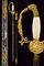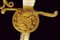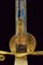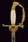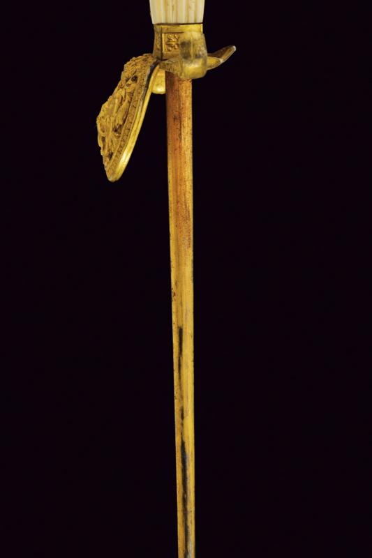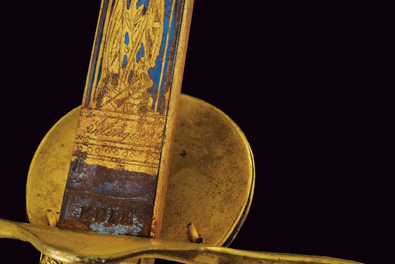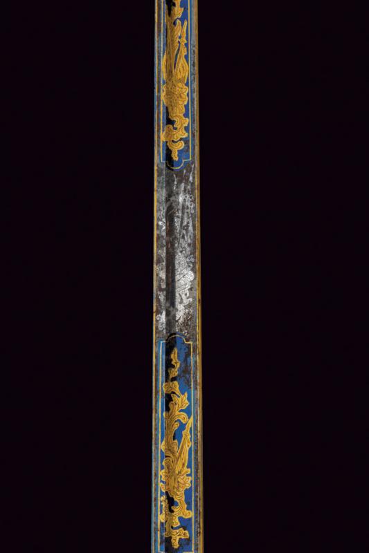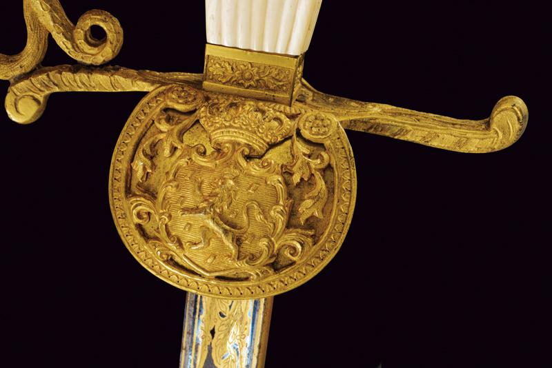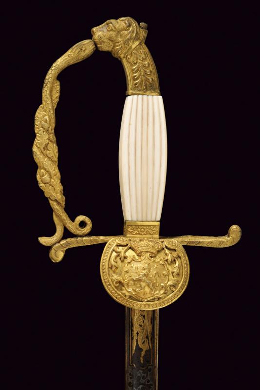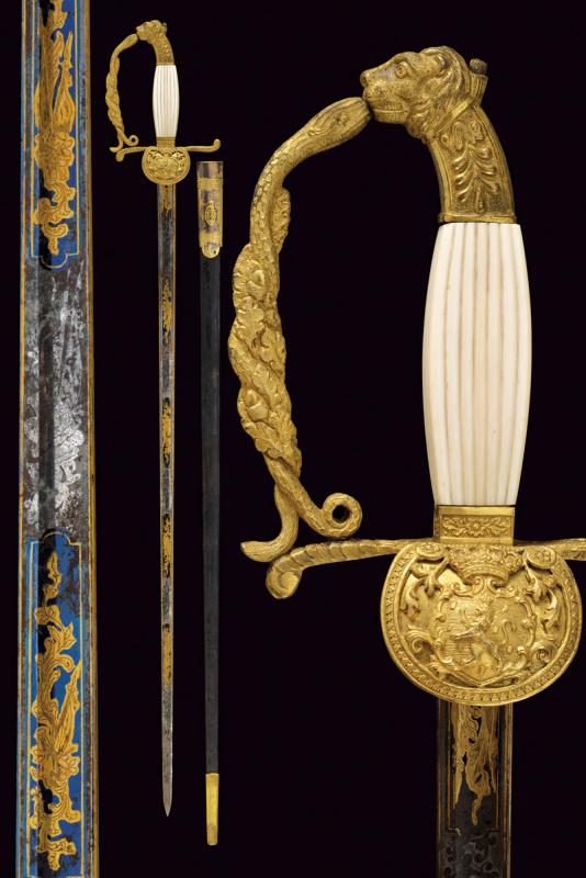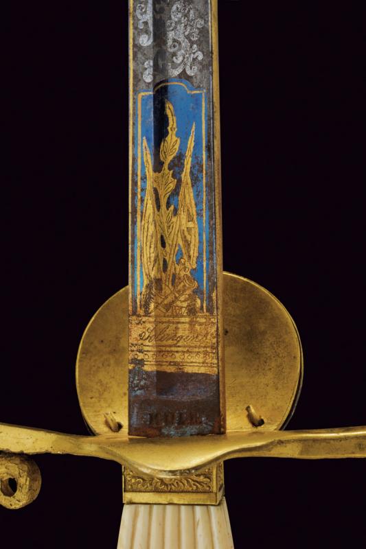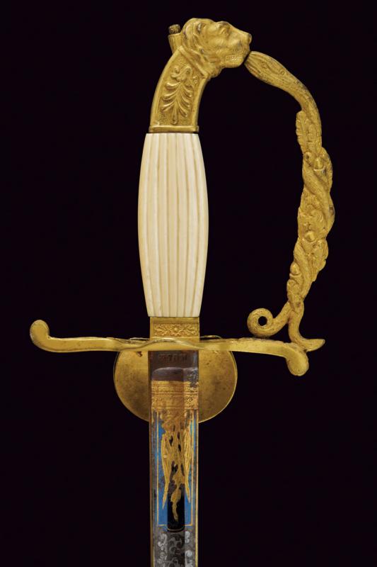 Spadino da funzionario con bellissima lama, datazione: Seconda metà del XIX Secolo provenienza: Belgio, Lama dritta a un filo e breve controfilo con sguscio centrale, decorato quasi su tutta la lunghezza con incisioni dorate su fondo blu alternate con segmenti incisi su fondo opaco raffiguranti trofei e motivi floreali. La base firmata 'Müll Solingen', sul breve tallone 'MÜLL'. Al debole piccole zone di ruggine. Bel fornimento in ottone dorato, la pelta con leone sotto corona, guardia con serpente e pomo a testa di leone. Impugnatura in avorio scanalato. Fodero in cuoio con fornimenti in ottone dorato ed inciso. lunghezza 91.5 cm.