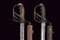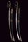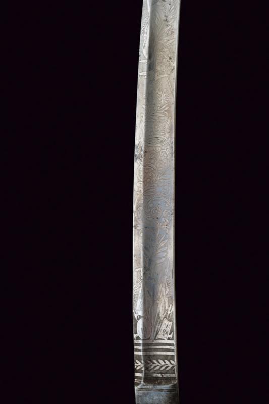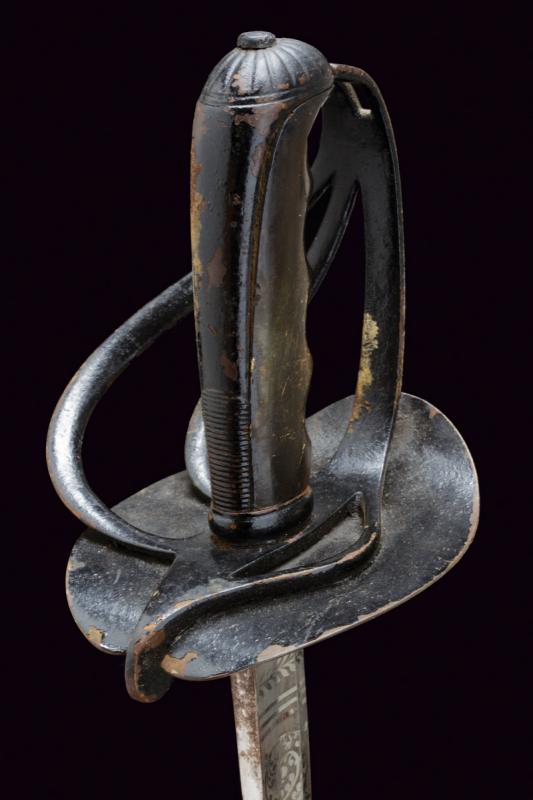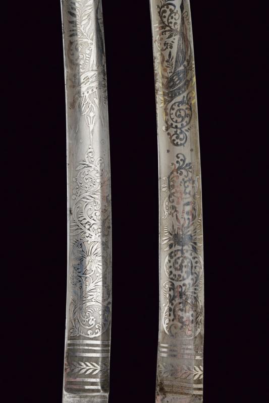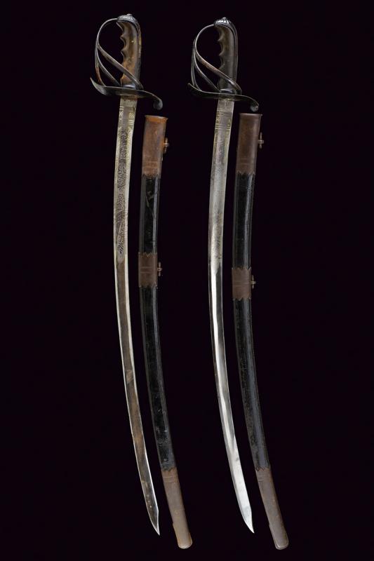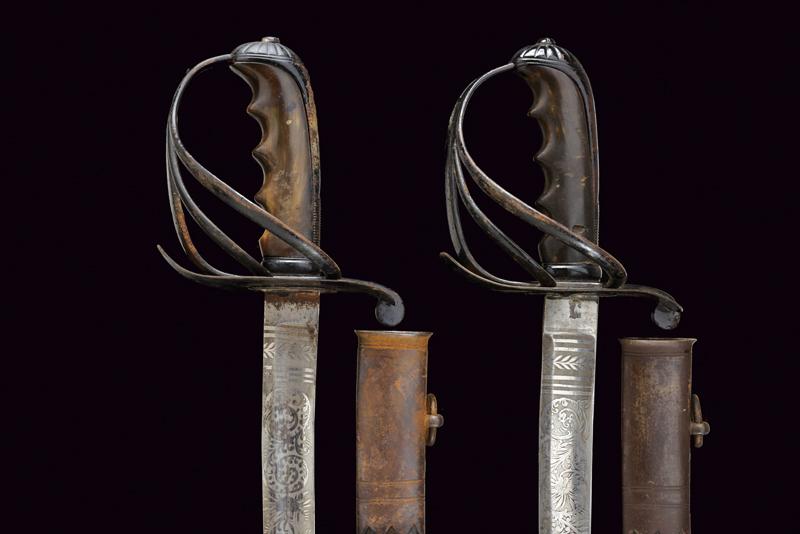 Paio di sciabole da duello, datazione: XIX Secolo provenienza: Europa, Lame di mezza larghezza, curve a un filo e controfilo con punta incavata, con ampio sguscio, incise nella prima parte a trofei e motivi floreali di buona qualità ma con diversi motivi, una con marca sul tallone. Fornimenti in ferro annerito con larga valva, tre rami di guardia, cappa con scanalature al pomo ed impugnature anatomiche in corno. Foderi in cuoio con fornimenti in ottone e due anelli di sospensione. lunghezza 97 cm.