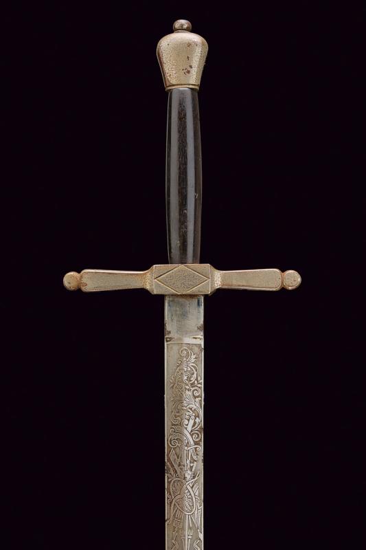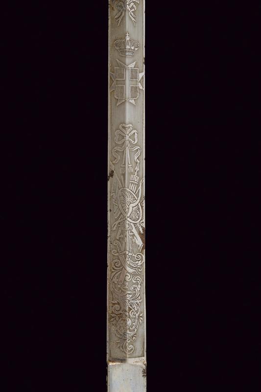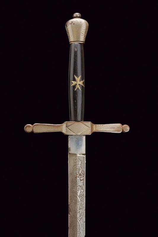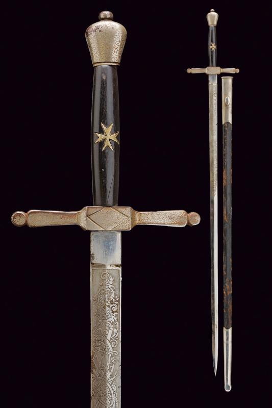 Spada con croce di Malta, datazione: 1900 circa provenienza: Italia, Lama a due fili di sezione a losanga, la prima parte incisa con croce Sabauda sotto corona, trofei e motivi floreali. Tallone. Fornimento in ferro nichelato (mancanze) con impugnatura in legno e croce di Malta sul lato anteriore. Fodero in cuoio con fornimenti in ferro nichelato. Rara. Vedi 'Storia dell'Arma Bianca Italiana' di Calamandrei, pag. 388. lunghezza 91.5 cm.