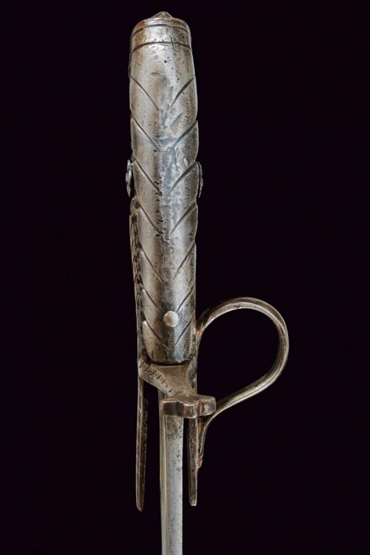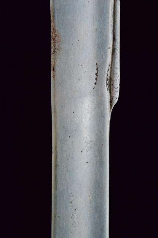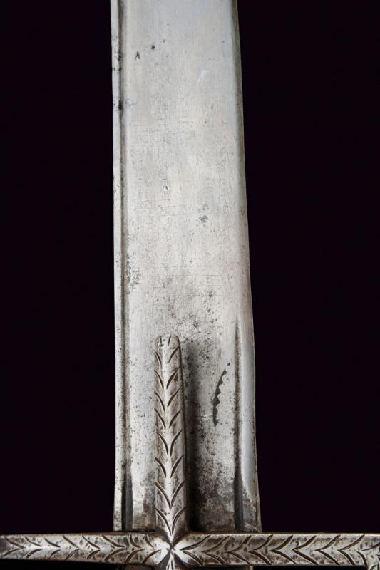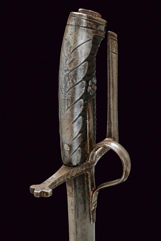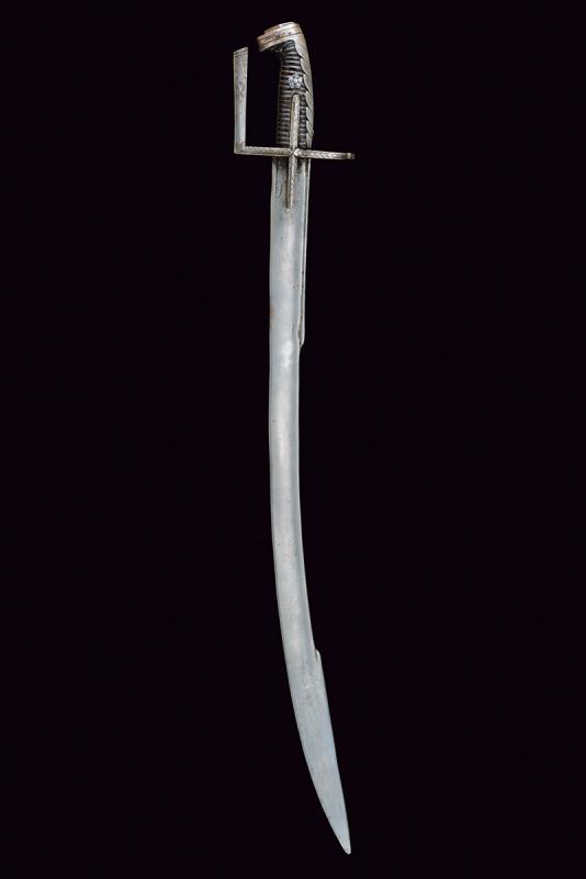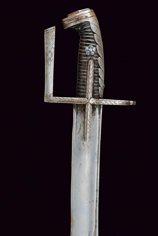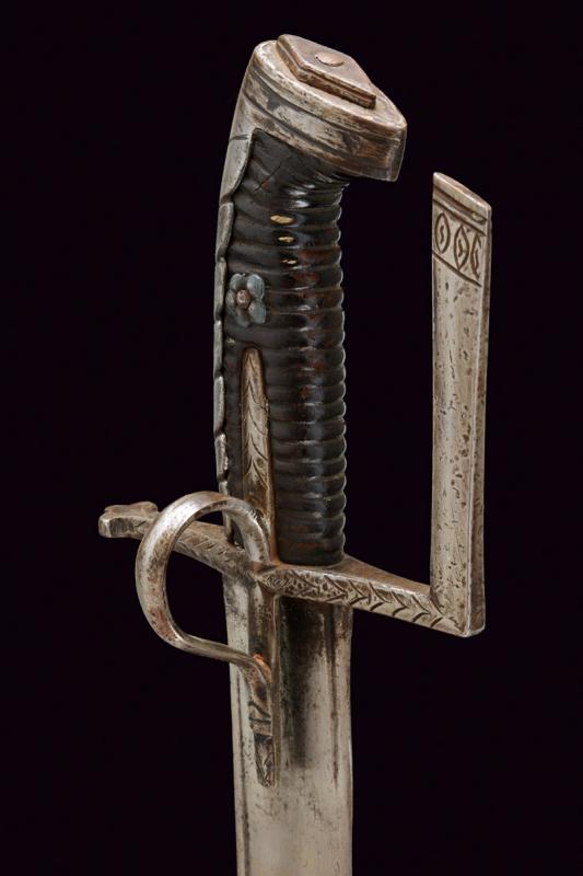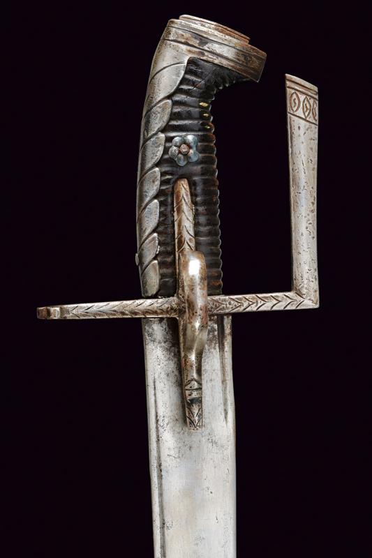 Sciabola da ussaro, datazione: XVIII Secolo provenienza: Polonia, Larga lama curva a un filo e controfilo, leggermente allargata verso il debole, la base con dorso alzato e punzoni dentati. Fornimento in ferro con elso a croce e ramo di guardia angolato, inciso a fogliame, tipica cappa appuntita con lungo dorso intagliato a foglie. Anello da pollice. Impugnatura in legno rivestita di cuoio. lunghezza 90.5 cm.