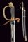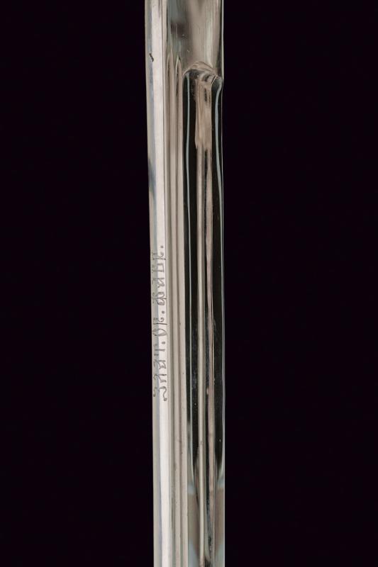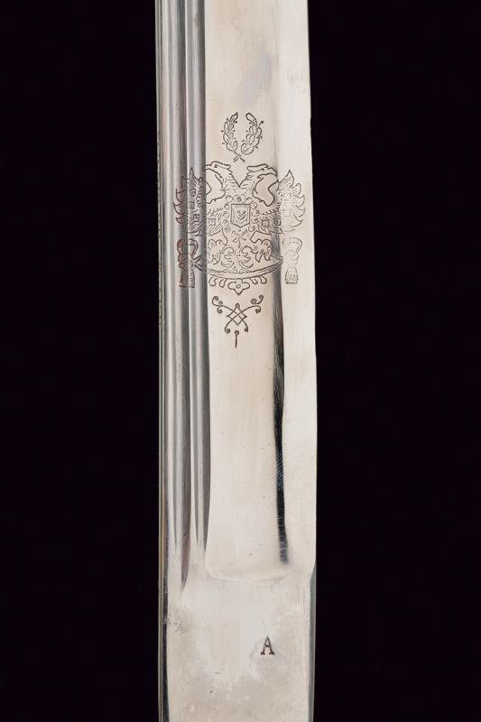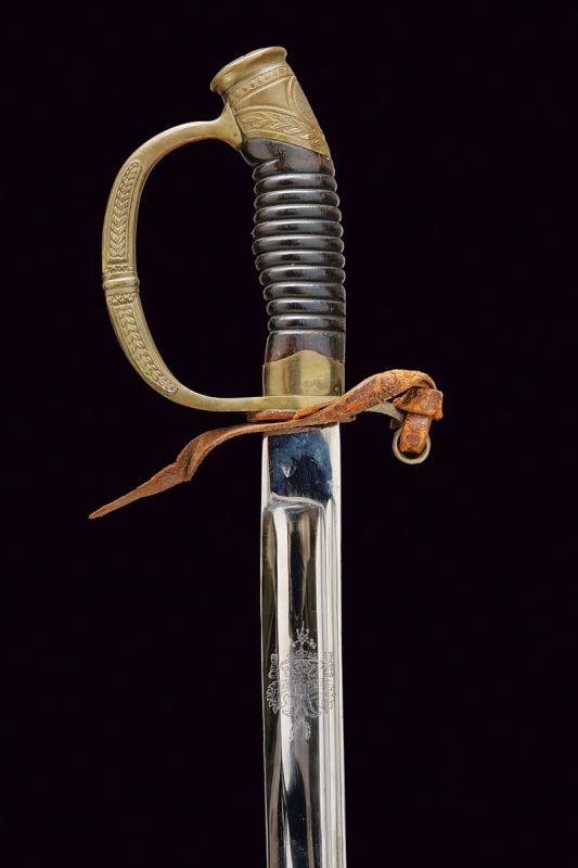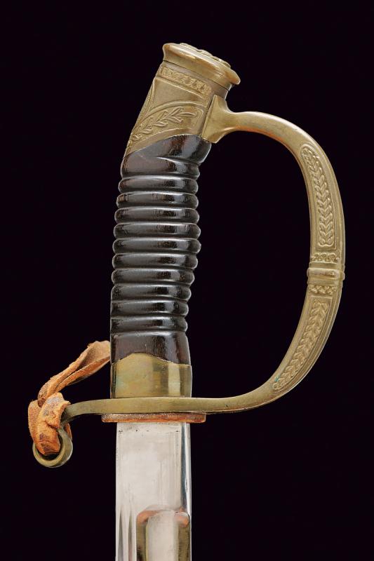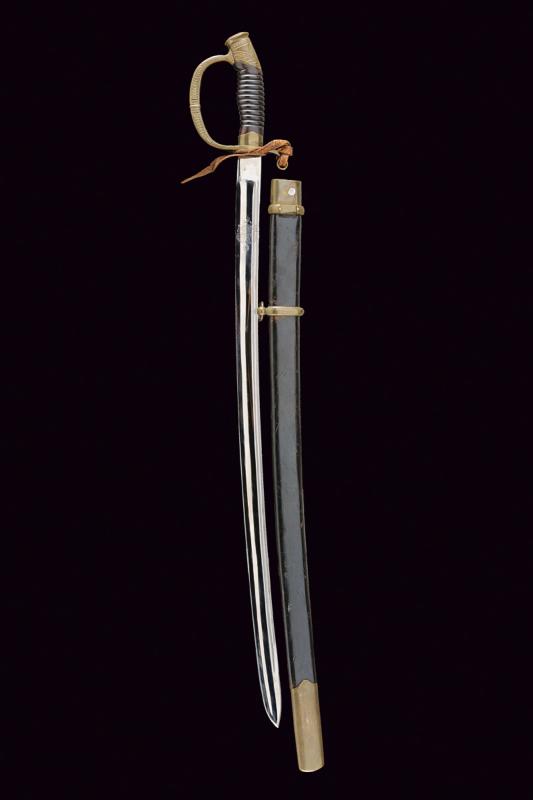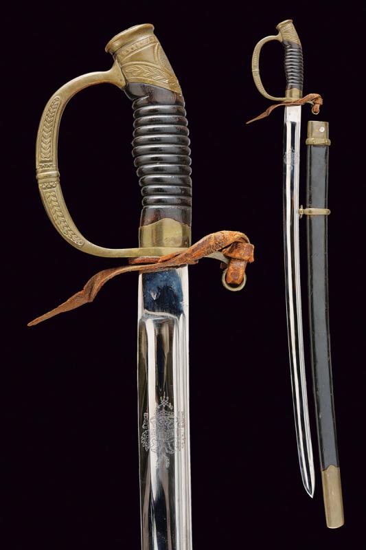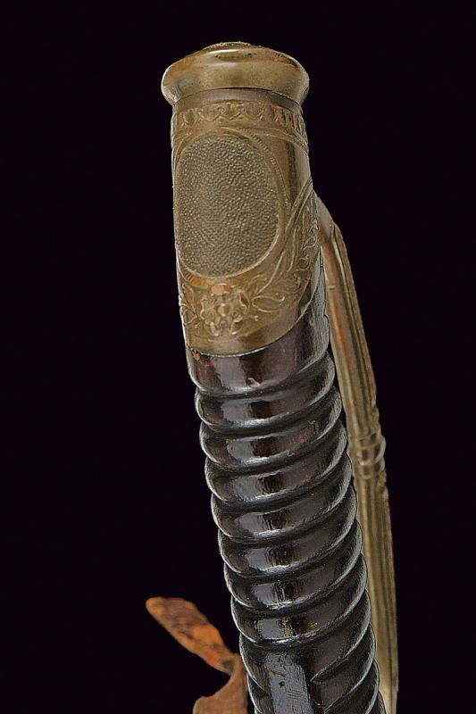 Shasqua da ufficiale Mod. 1881, datazione: 1900 circa provenienza: Russia, Lama leggermente curva a un filo, punta e controfilo, con ampio sguscio centrale e due scanalature accanto al dorso, recante al forte sul lato di terza un'aquila bicipite sormontata da fronde di lauro; punzone 'A' al tallone. Fornimento in ottone con guardia recante foglie in rilievo, cappetta corta con fronde di lauro, impugnatura in legno o corno. Fodero con rivestimento laccato, fornimenti in ottone con un passante e una camapanella. lunghezza 90 cm.