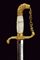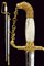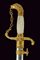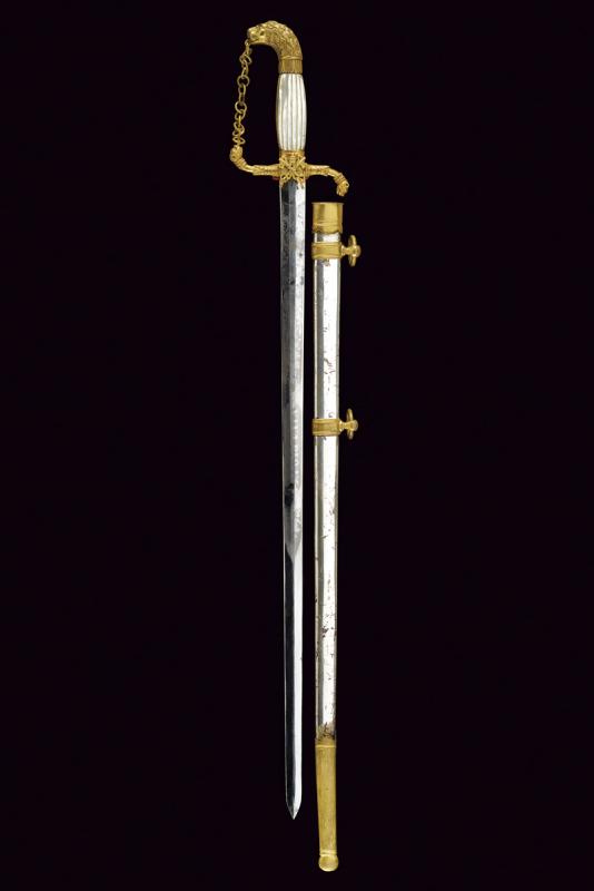 Interessante spadino, datazione: Terzo quarto del XIX Secolo provenienza: Stato Pontificio, Lama a due fili di sezione esagonale incisa con motto 'VIVA PIO IX' e 'VIVA LA RELIGIONE' fra motivi floreali. Interessante fornimento in ottone dorato con elso a 'S', i bracci terminanti in teste di leone come anche il pomo. Massello con chiavi incrociate e tiara, impugnatura con guancette in madreperla. Catenina. Completa di fodero. lunghezza 70 cm.