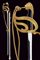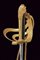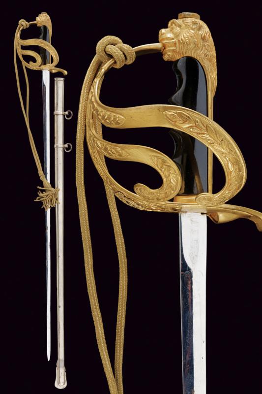 Sciabola da guardia Palatina, datazione: 1900 circa provenienza: Stato Pontificio, Lama dritta a due fili, la prima parte incisa, il tallone firmata 'V. BIFULCO NAPOLI'. Fornimento in metallo dorato decorato a motivi floreali in bassorilievo e munito di piccolo monogramma nobiliare. Pomo a testa di leone, impugnatura anatomica di legno. Completa di fodero a due anelli di sospensione e dragona. lunghezza 94.5 cm.