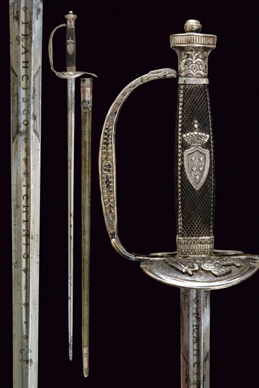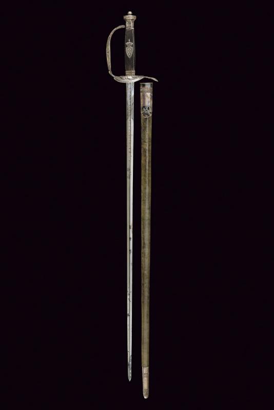 Bellissimo spadino con fornimenti in argento, datazione: 1807 provenienza: Europa, Lama dritta a due fili di sezione esagonale, la prima parte sgusciata con iscrizione 'FRANCISCO PICININO' su entrambi i lati fra piccoli decorazioni. Fornimento in argento, pelta con aquila bicipite sotto corona, con spada e scudo con cinque volatili. Pomo a disco con collo ristretto, decorato a motivi floreali in bassorilievo come tutto il fornimento. Impugnatura in legno zigrinato, di fronte uno scudo con cinque volatili sotto corona, dietro uno scudetto con monogramma 'I' o 'T'. Fodero in legno rivestito con pelle di rettile e fornimenti in argento inciso, il gancio a forma di volatile. Tutti i parti in argento con punzoni '1807', 'CA' ed un'altro poco leggibile. Raro. lunghezza 92 cm.