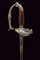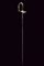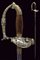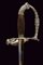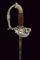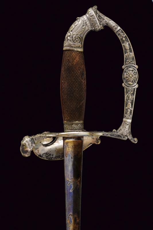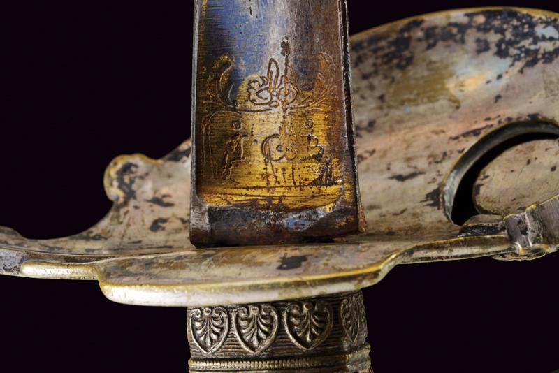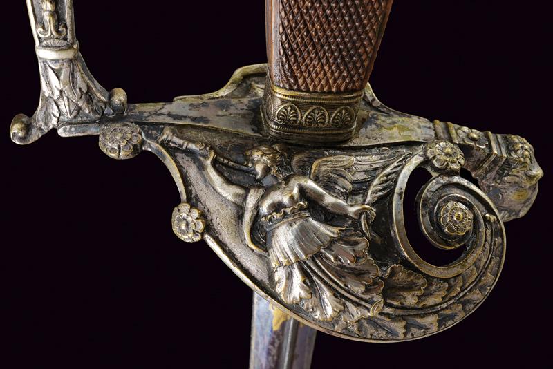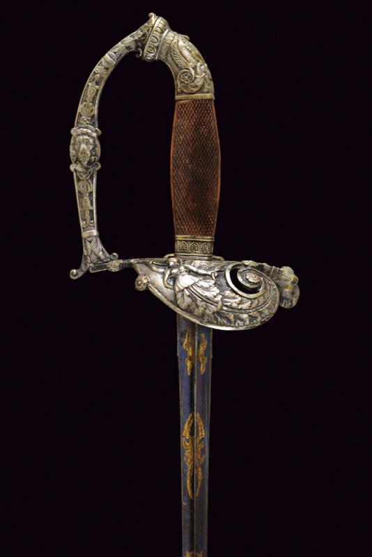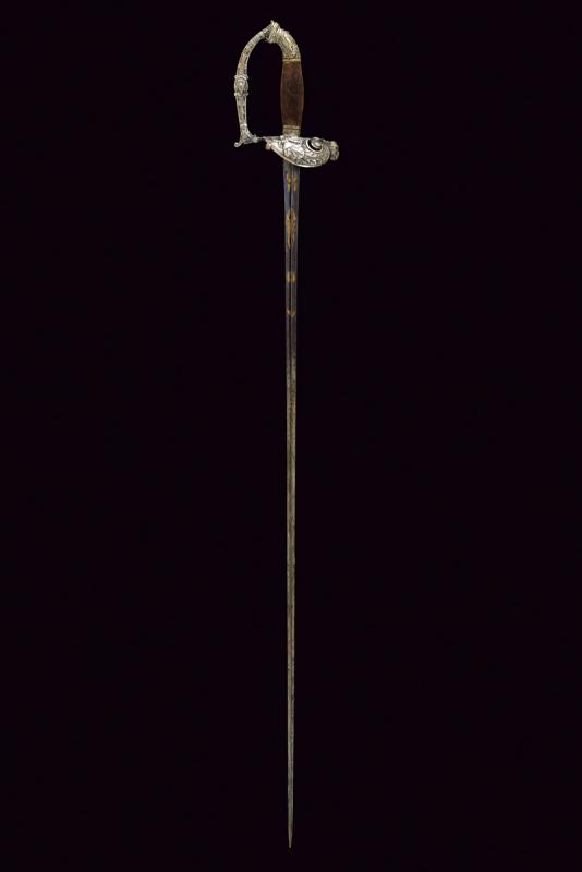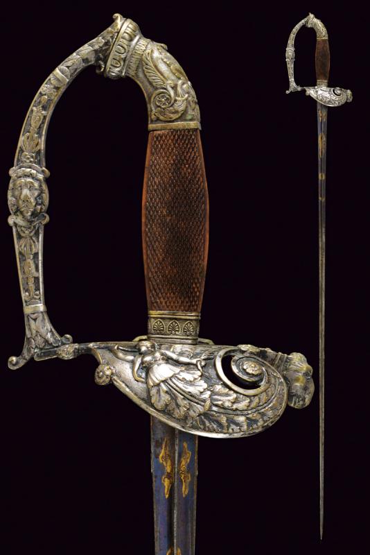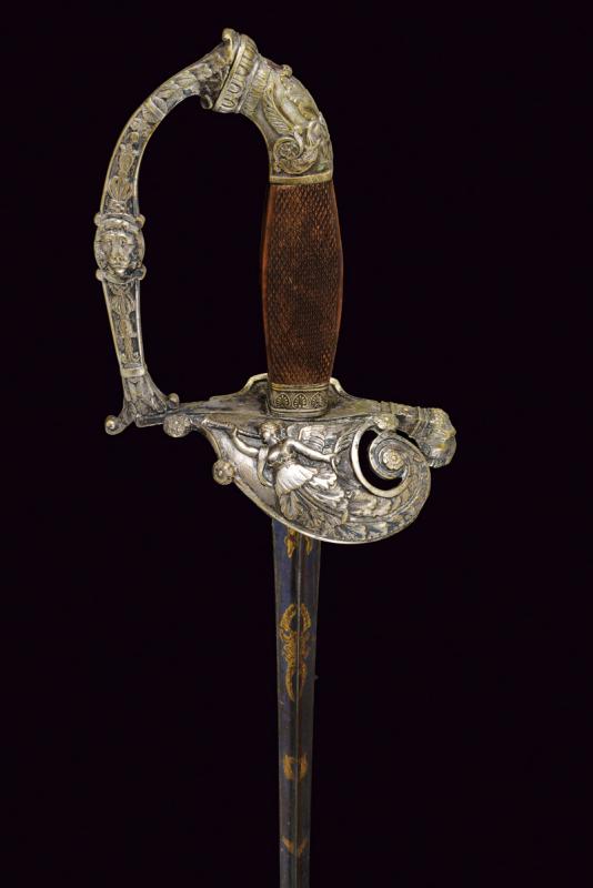 Bello spadino, datazione: Metà del XIX Secolo provenienza: Italia, Lama di sezione triangolare con facce incavate, la prima parte incisa e dorata su fondo blu a trofei e motivi floreali. Fornimento in ottone argentato, la pelta asimmetrica decorata con un angelo con tromba, il ramo di guardia con testa di leone, il resto del fornimento a motivi floreali. Impugnatura in legno zigrinato. Senza fodero. lunghezza 96 cm.