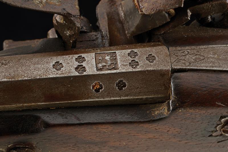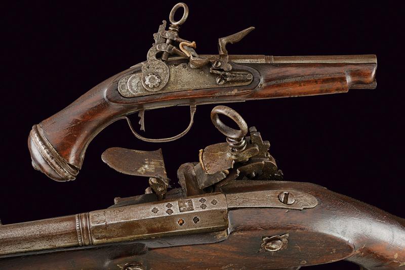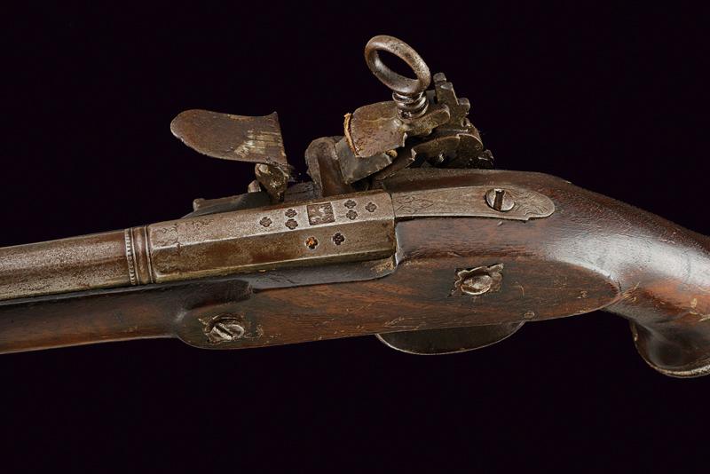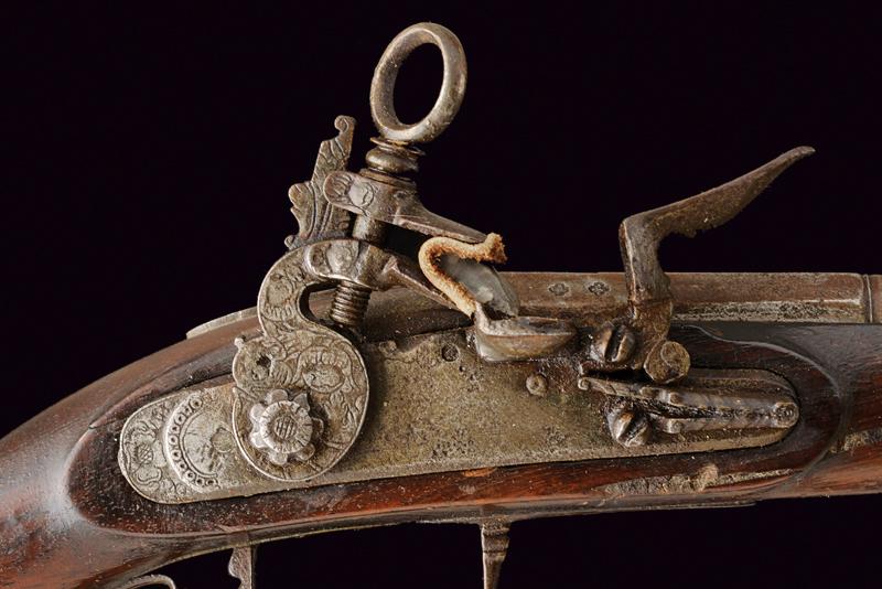 Interessante pistola pietra focaia, datazione: Seconda metà del XVII Secolo provenienza: Italia settentrionale, Canna liscia a due ordini, la prima parte ottagonale recante un punzone con cavallo tra gigli con resti di doratura, dopo un anello liscio ed uno perlinato tonda, cal. 12 mm; batteria lunga con coda, molla e cane inciso. Cassa intera in legno (piccole mancanze e difetti, forse ricalciata in tempi successivi) con fornimenti in ferro inciso e intagliato. Bacchetta in legno. lunghezza 29 cm.