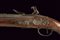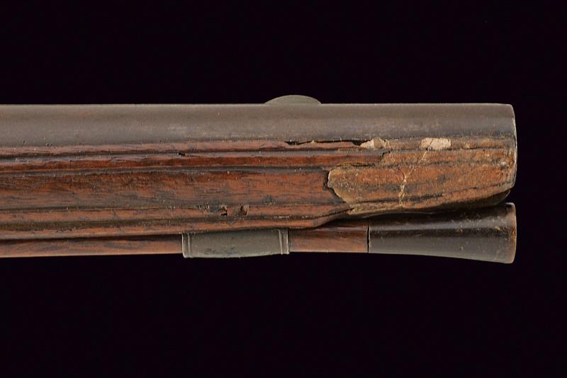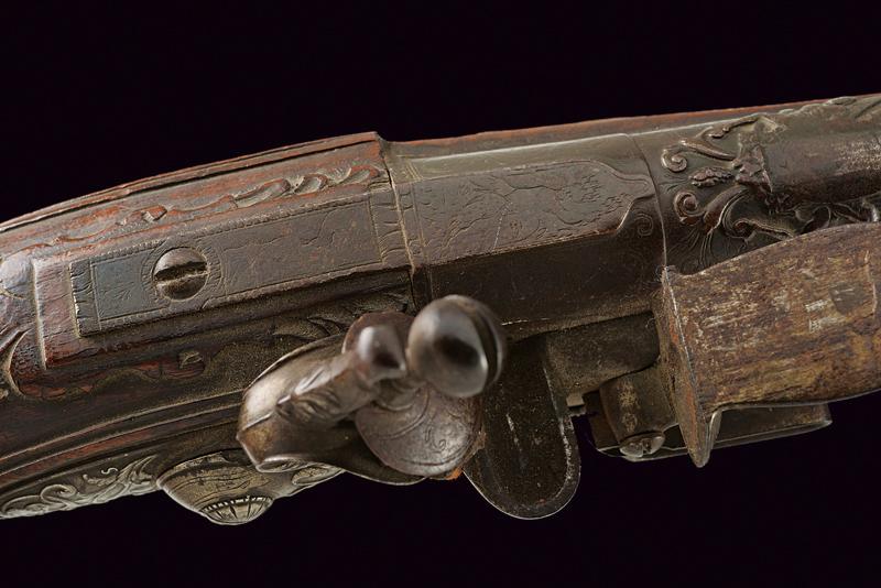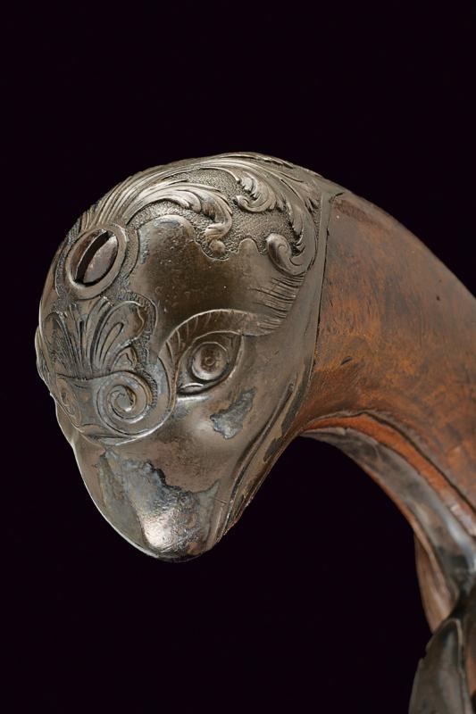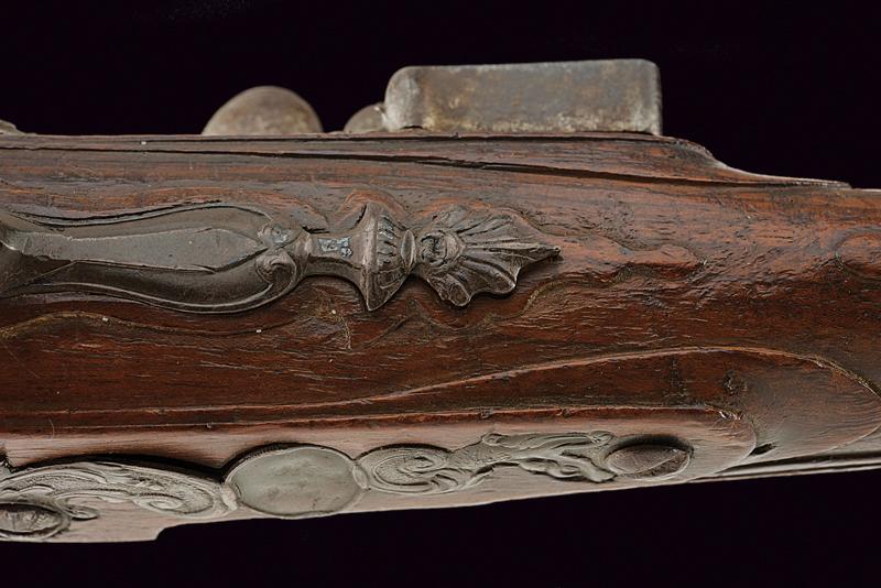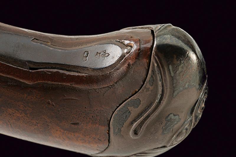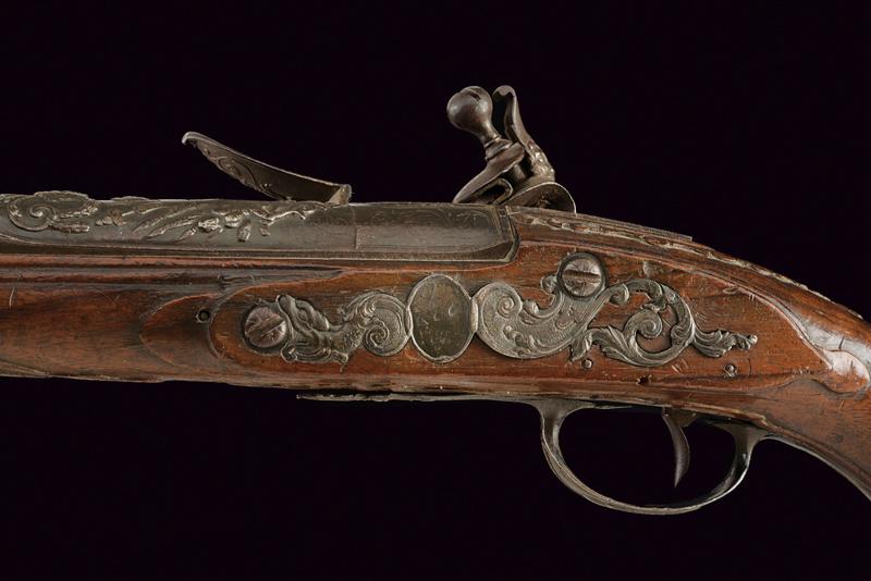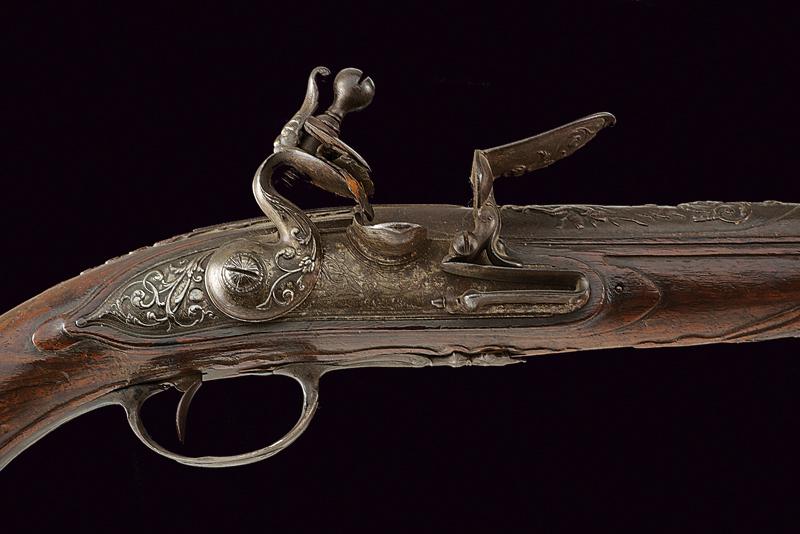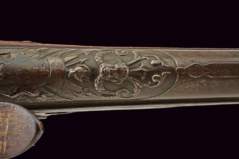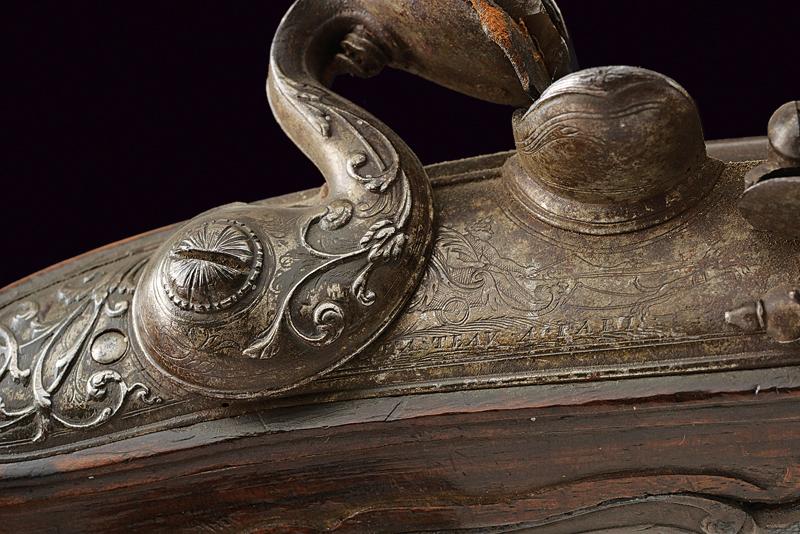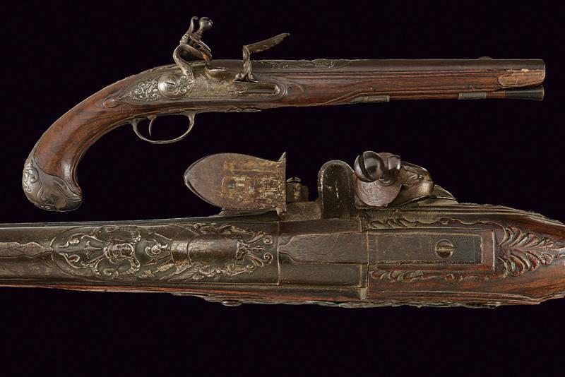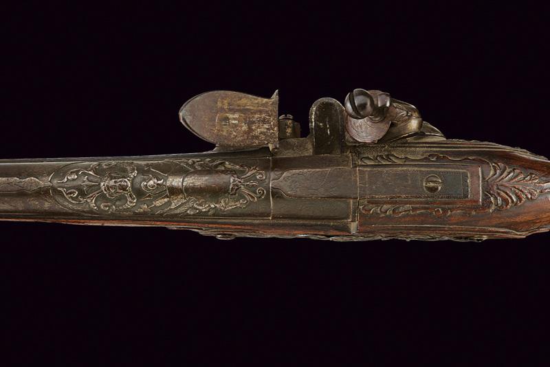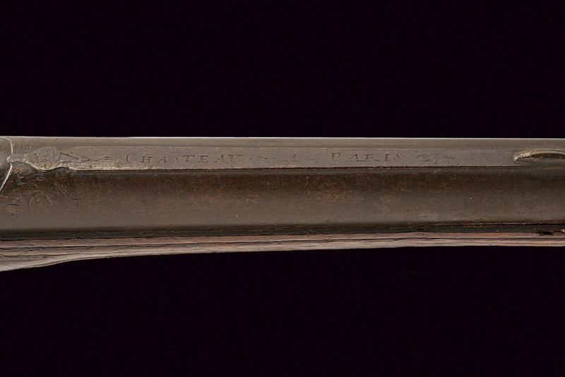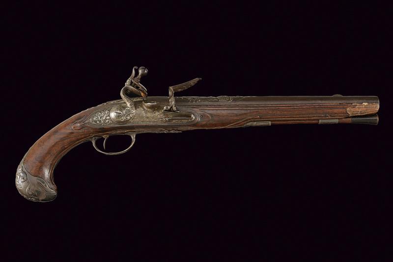 Pistola a pietra focaia di Chasteau a Parigi, datazione: Seconda metà del XVIII secolo provenienza: Francia, Canna in ferro, dotata di bindella dorsale con mirino e recante la firma 'CHASTEAU A PARIS', a seguire un grande trofeo finemente lavorato in rilievo, non leggibile, attorniato da lance e stendardi, sorretto da due personaggi e sormontato da un mascherone arricchito da ghirlande; le tre facce della culatta con resti di incisioni a racemi e un personaggio mitologico con corona di fiamme. Cal. 15,5 mm. in volata.Il codolo con un altro personaggio, non chiaramente visibile. Batteria con cartella leggermente tondeggiante. La codetta con racemi in rilievo. L'area centrale con effige incisa di un personaggio con corona di lauro che guida un cocchio trainato da cani. In basso il cartiglio con la firma 'CHASTEAV A PARIS'. Cane e martellina con fini decorazioni floreali e a mascheroni in rilievo. Meccanica funzionante. Cassa intera in legno con piccolo restauro nella parte anteriore. Bei fornimenti in argento punzonato. Coccia a becco d'uccello sempre con punzoni e decoro a vaso. Contropiastra con grottesche. Bacchetta in legno con battipalla in corno. Probabilmente François-Alexander Chasteau, di Parigi, documentato sino al 1784 come 'Armurier du Roi'. lunghezza 42 cm.