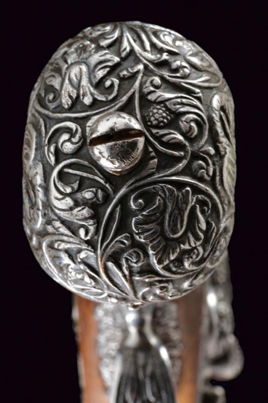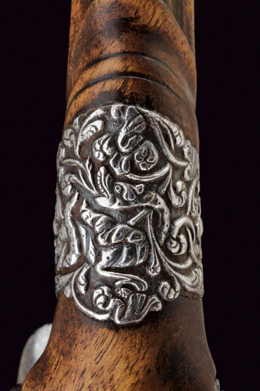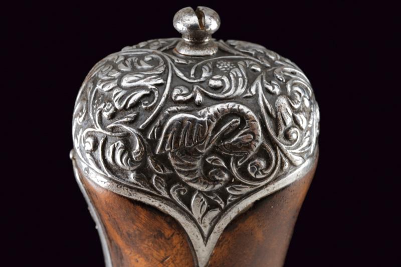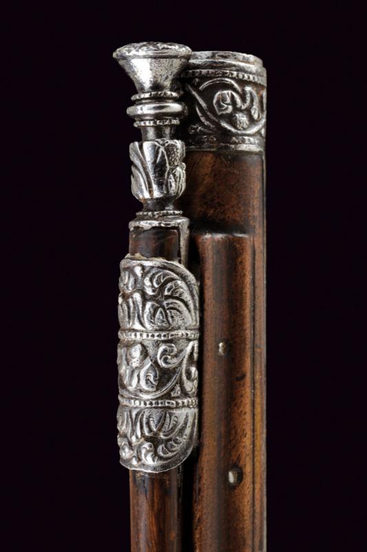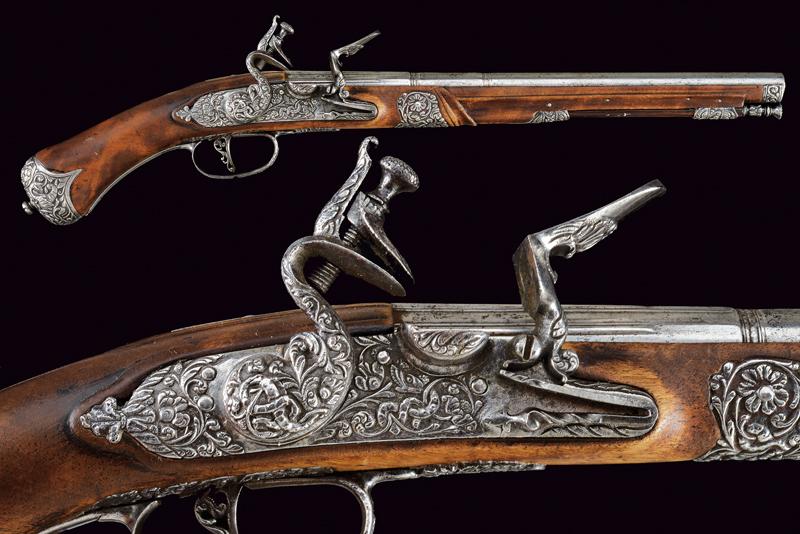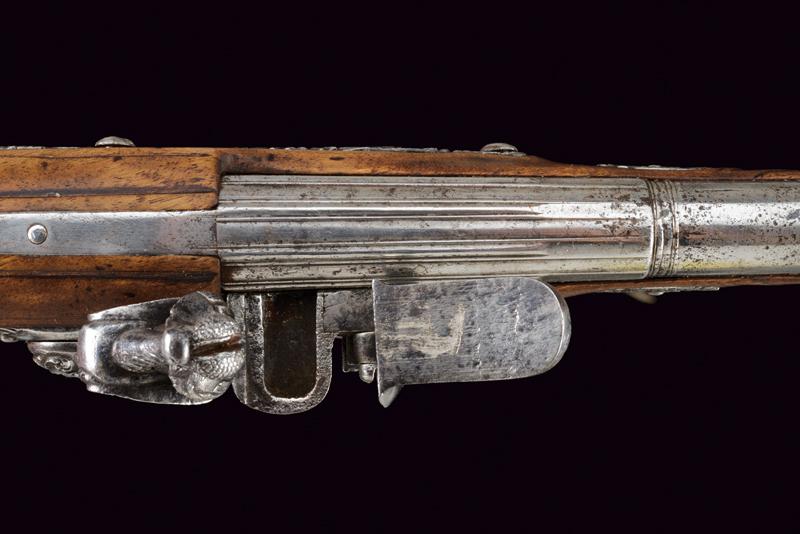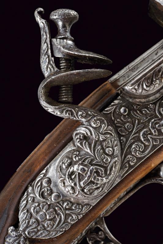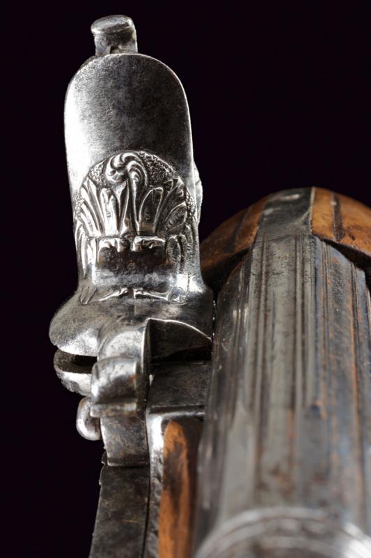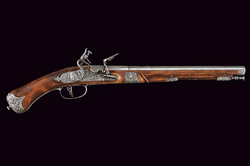 Bellissima pistola da fonda a pietra focaia, datazione: XVII Secolo provenienza: Brescia, Lunga canna liscia a quattro ordini, prima ottagonale con nervature, dopo un piccolo segmento a sedici facce, cal. 13 mm; codetta liscia. Bellissima batteria riccamente intagliato a motivi floreali e con serpenti stilizzati in bassorilievo. Cassa intera in legno con fornimenti in ferro decorato en suite. Il grilletto traforato, la contropiastra con fori per un gancio da cintura ora mancante. Bacchetta in legno con battipalla in ferro intagliato. lunghezza 47 cm.