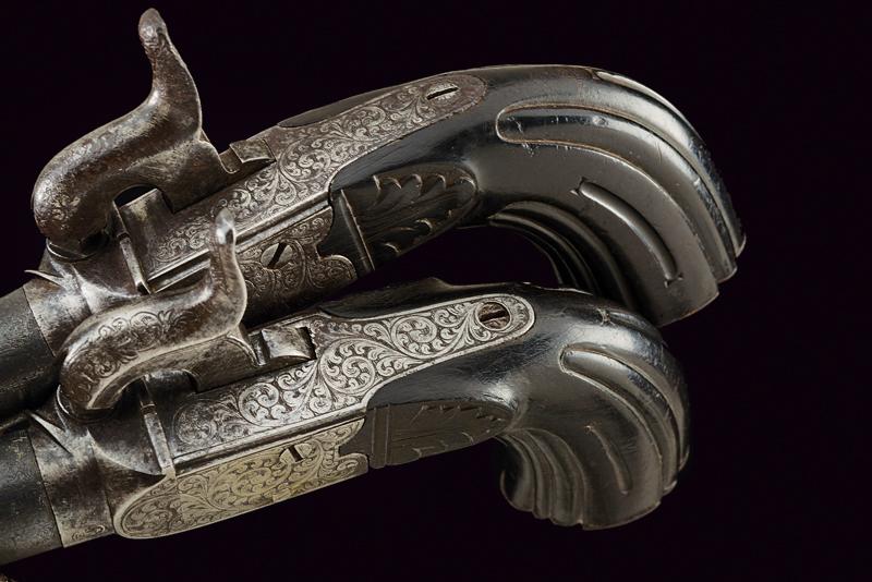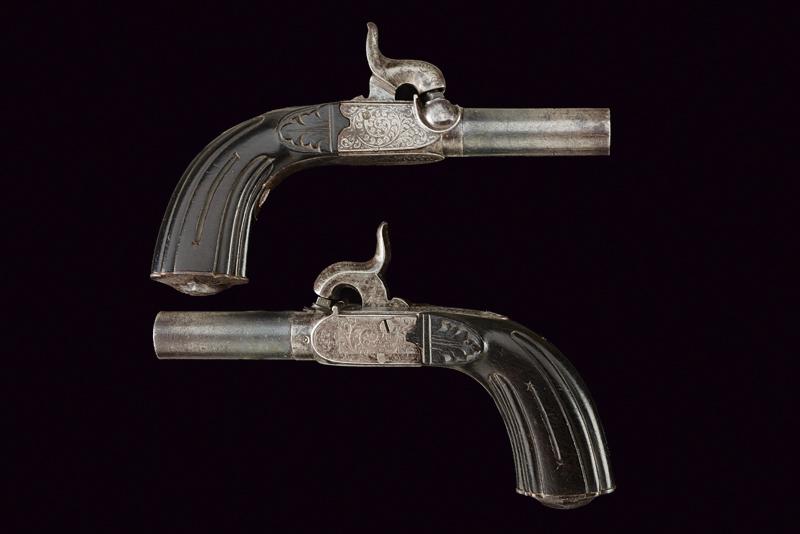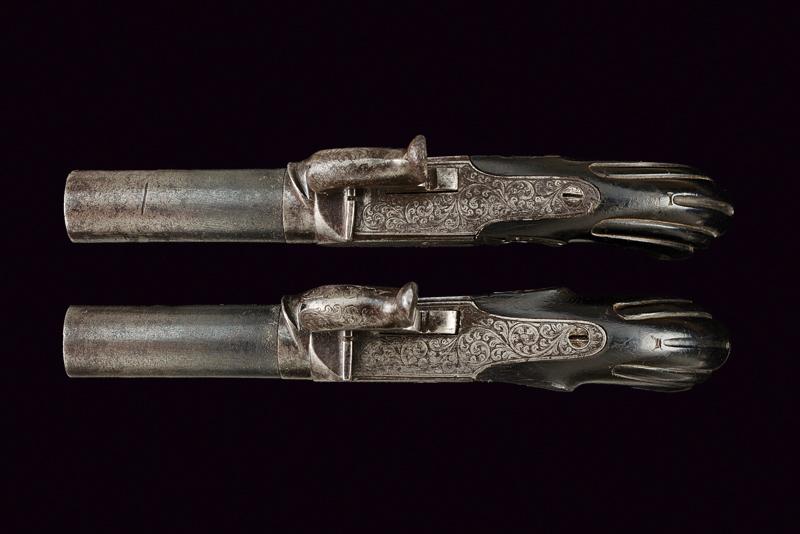 Paio di mazzagatti a luminello, datazione: Metà del XIX Secolo provenienza: Belgio, Canne cilindriche svitabili, con resti di damasco, cal. 12 mm. Castelli di tipo boxlock finemente incisi a racemi su fondo a trattini. Punzoni del banco di Liegi. Grilletti a scomparsa. Cani dorsali. Meccaniche funzionanti. Calci in ebano con scanalature. Cocce incise en suite. lunghezza 15,3 cm.