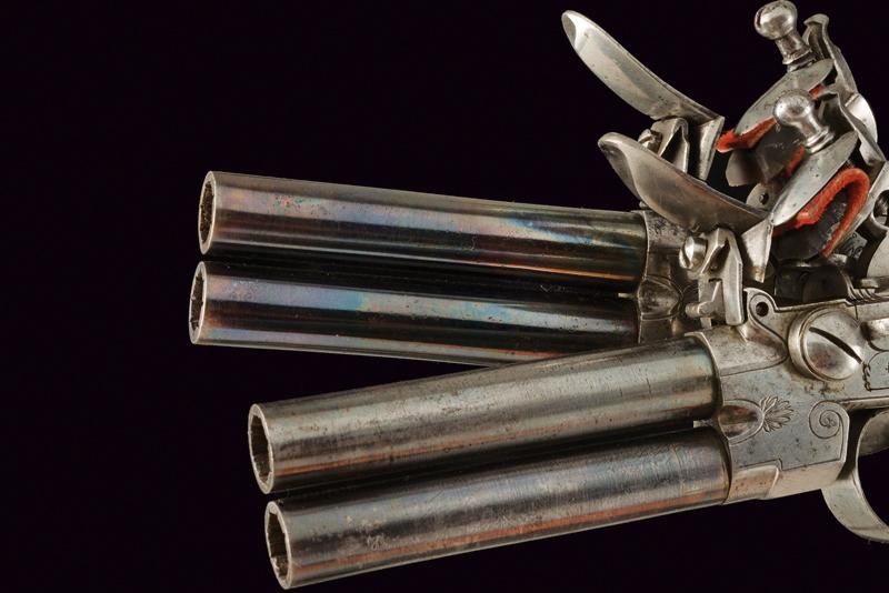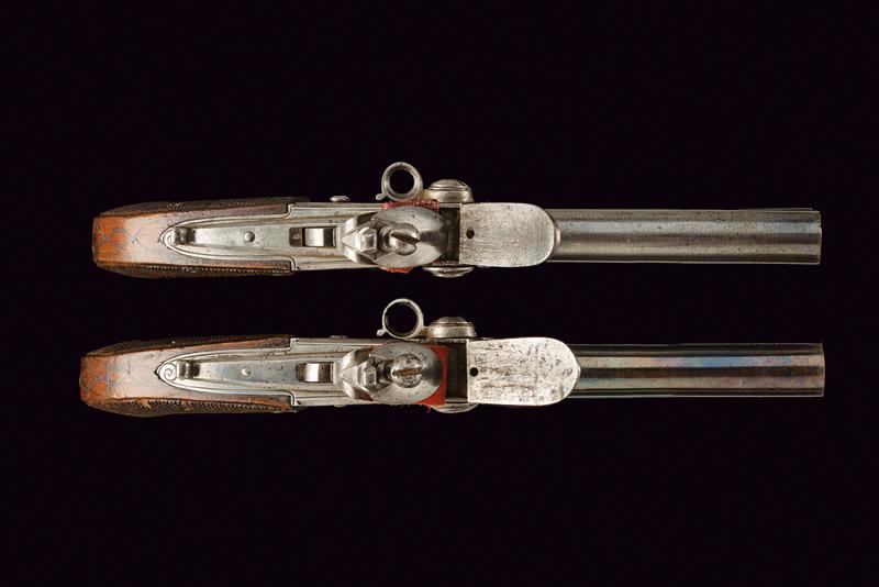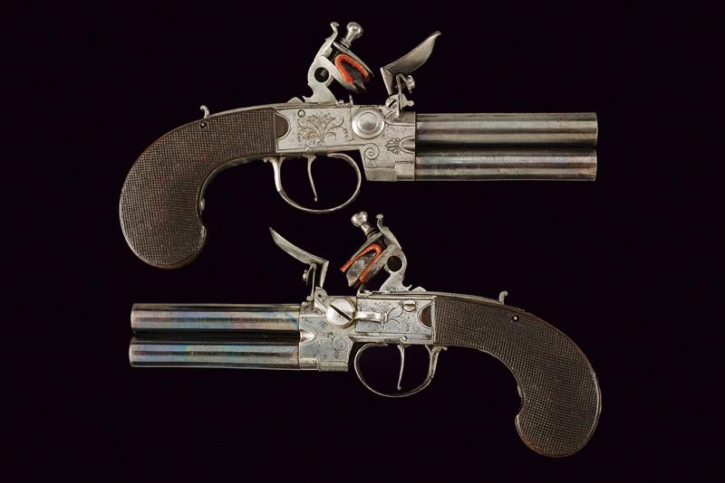Paio di mazzagatti a due canne sovrapposte a pietra focaia, datazione: 1800 circa provenienza: Francia, Canne tonde, sovrapposte, lisce, brunite, cal. 10 mm; castelli incisi a motivi floreali, cane superiore con sicura. Ponticelli delineati ai bordi. Calci in legno micro-rigati. lunghezza 21 cm.
