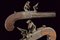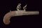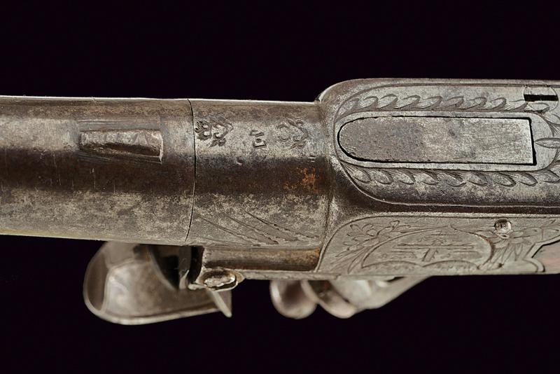 Raro mazzagatto a pietra della Polizia di Nottingham, datazione: Inizio del XIX Secolo provenienza: Inghilterra, Canna cilindrica liscia, svitabile, cal. 11,5 mm. La culatta con resti di punzoni del banco di prova nella parte inferiore. Castello di tipo boxlock. Martellina dorsale (qualche problema alla chiusura). Cane dorsale. Sempre al dorso anche la sicura. Sul fianco destro incisione a scudo con croce spinata e tre corone (emblema della città di Nottingham), su quello sinistro la dicitura 'NOTTINGHAM POLICE'. Calcio liscio in legno. Piccole incisioni e delineature. Meccanica funzionante. Grilletto a scomparsa. lunghezza 16 cm.