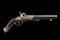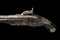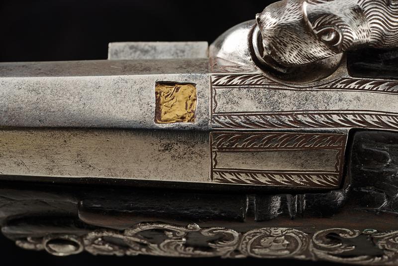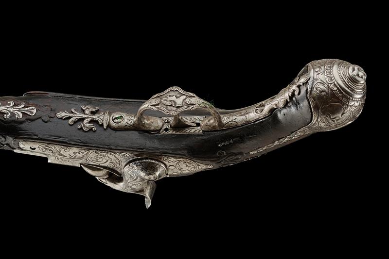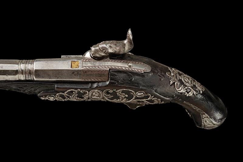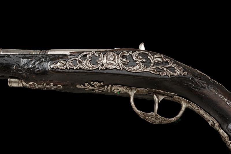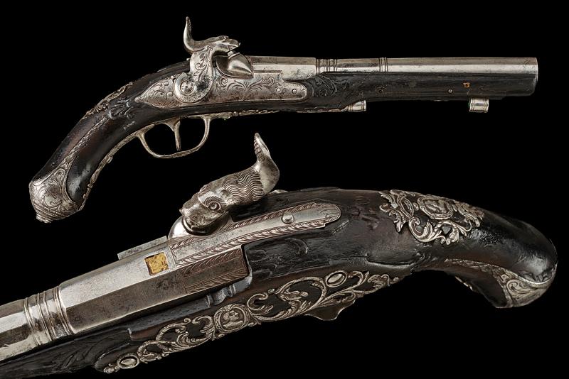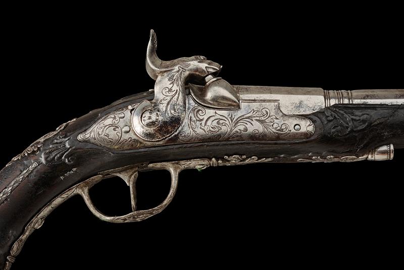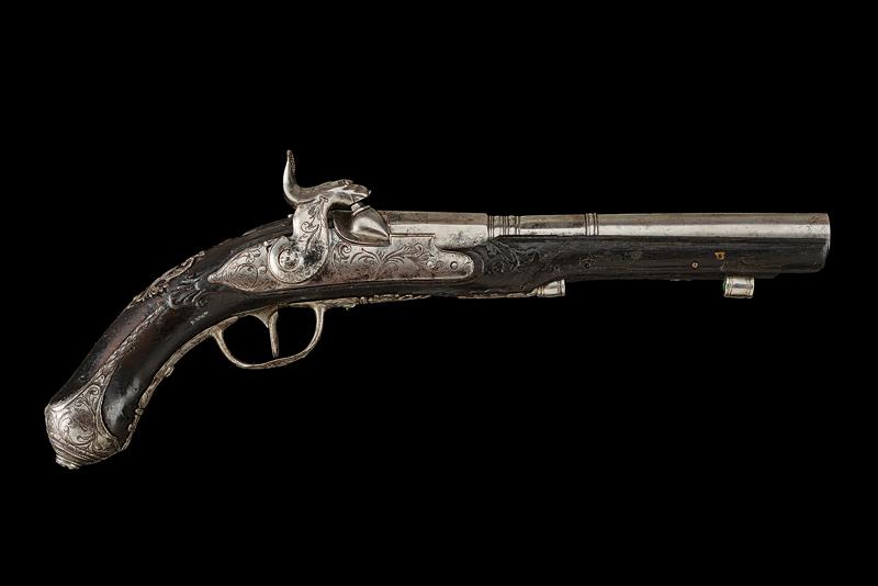 Pistola ridotta a luminello, datazione: Seconda metà del XVIII secolo provenienza: Toscana, Bella canna liscia a tre ordini, la prima parte ottagonale con incisioni alla base e con marca rimessa in oro, dopo vari anelli un segmento a dodici facce ed in fine tonda, cal. 13 mm; codetta incisa en suite. Batteria a molla in avanti ridotta a luminello, incisa a motivi floreali e con un serpente. Cassa intera (la sottocanna restaurata) con bellissimi fornimenti in acciaio intagliato, inciso e traforato con busti, serpenti e motivi floreali. Bacchetta mancante. lunghezza 27.5 cm.