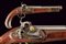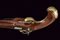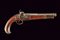 Pistola a luminello alla micheletta, datazione: Metà del XIX Secolo provenienza: Napoli, Canna liscia a due ordini, prima ottagonale poi tonda suddiviso da un anello, la base con cornice con resti di doratura, mirino in ottone, volata con gioia di bocca, cal. 17 mm; batteria alla micheletta firmata 'BISANTI', la base del luminello con scanalature e resti di doratura, cassa intera in bel legno con fornimenti in ottone. Bacchetta e gancio di cintura in ferro. lunghezza 33.5 cm.