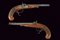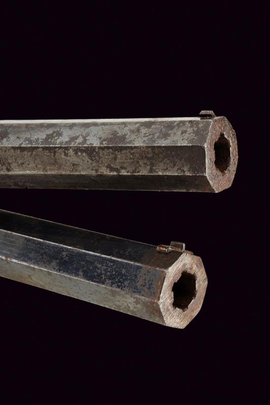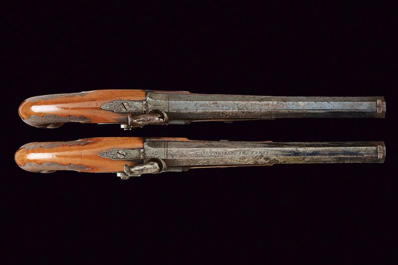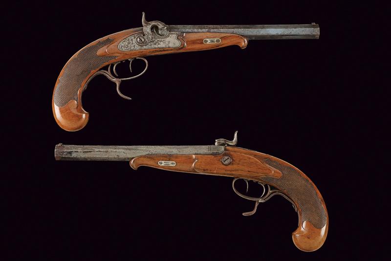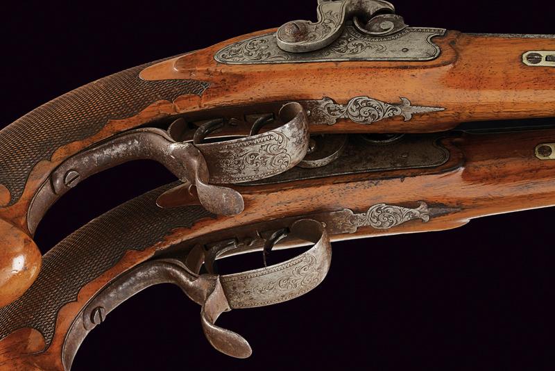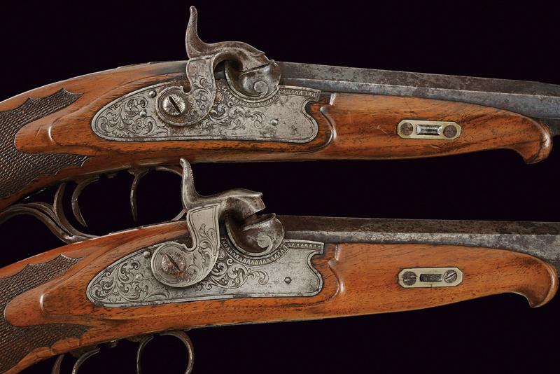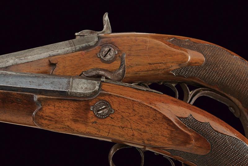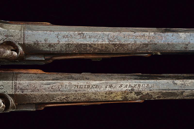 Paio di pistole a luminello da tiro di Carl Heidel a Salisburgo, datazione: Metà del XIX Secolo provenienza: Austria, Canne ottagonali rigate (rigature visibili, interno con incrostazioni, da pulire), recanti resti di brunitura antica, firma 'CARL HEIDEL IN SALZBURG', dotate di mirino. Cal. 9,8 mm. in volata. Culatte numerate '1' e '2' e munite di alzo fisso. Codoli incisi a racemi. Batterie a molla in avanti incise a motivi floreali e con cornicette. Meccaniche funzionanti. Grilletti e stecher funzionanti. Ponticelli con interessante poggiadito esterno. Casse a tre quarti in legno con zigrinature. lunghezza 36 cm.
