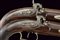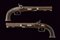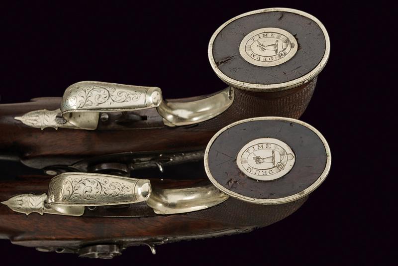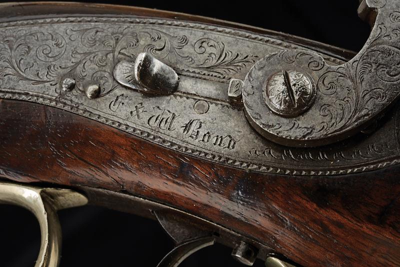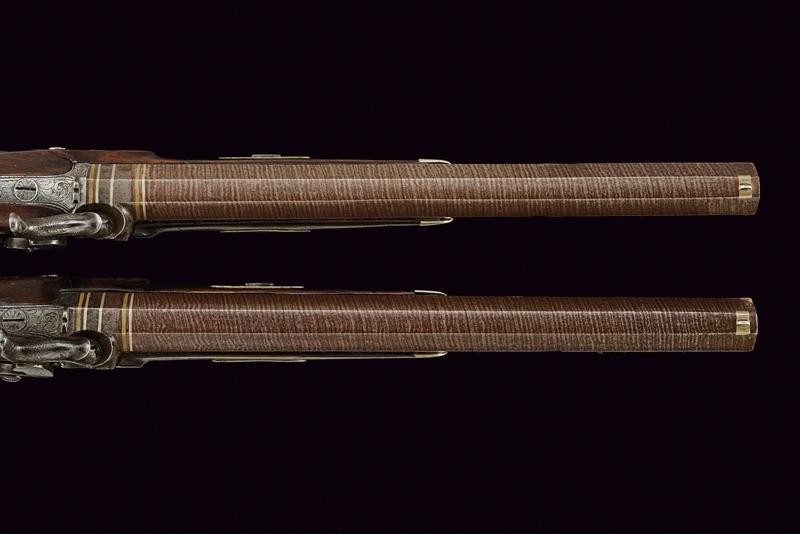 Paio di pistole a luminello da tiro di Bond, datazione: Metà del XIX Secolo provenienza: Londra, Lunghe, pesante canne ottagonali, rigati, damascati, con cornici in oro ed argento alla base, marcate 'LONDON', con mirino in argento, cal. 13 mm; codette incise e munite di alzo; eleganti batterie a molla indietro firmate 'F&M Bond', incise a motivi floreali e con sicura. Cassa a trequarti in legno con collo zigrinato e fornimenti in alpacca incisi a motivi floreali, le cocce con stemma di un braccio con pugnale e motto 'DEUM TIME'. Bacchette in legno con fornimenti in ottone. Grilletti con stecher integrato. lunghezza 41.5 cm.
