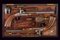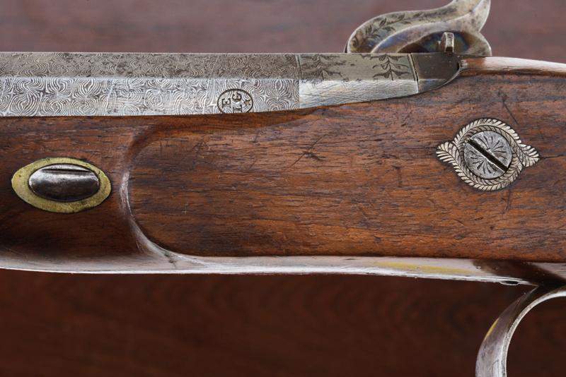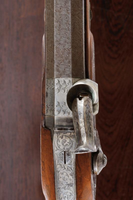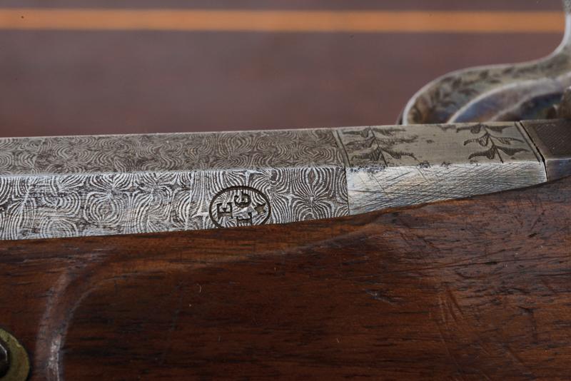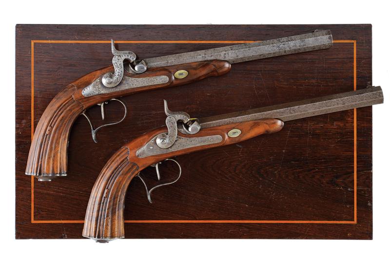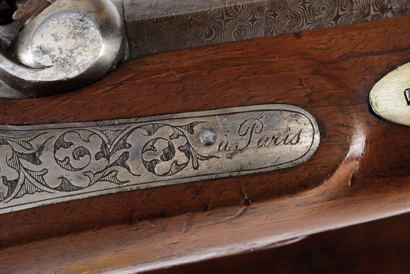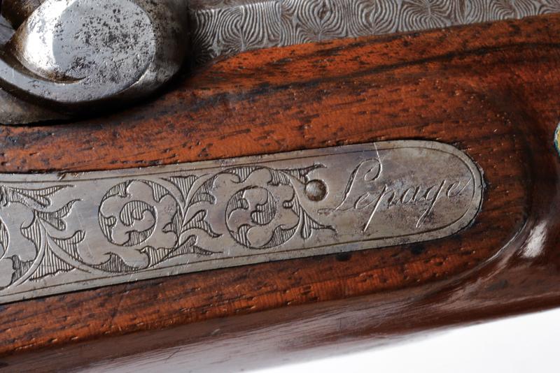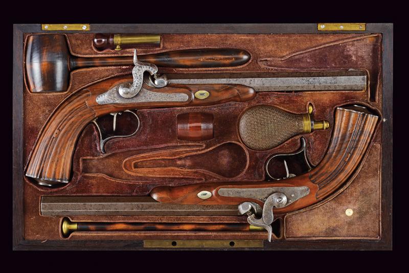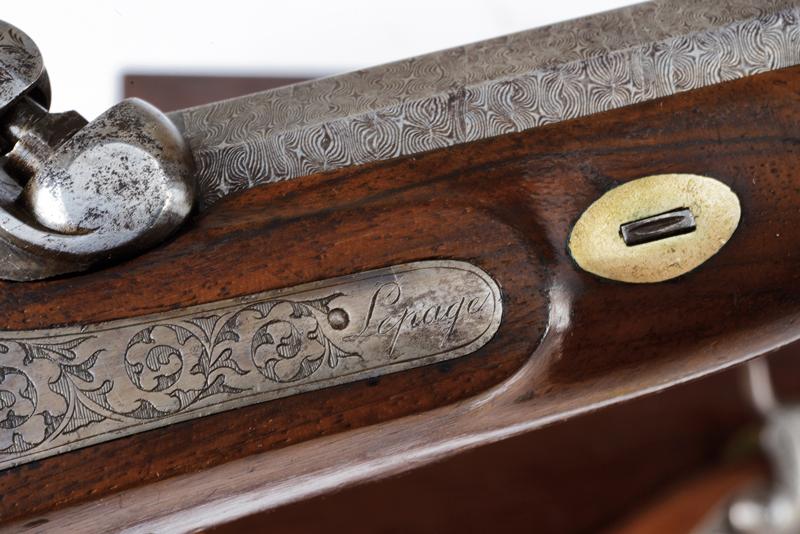 Paio di pistole a luminello di Lepage in cassetta, datazione: Metà del XIX Secolo provenienza: Parigi, Canne ottagonali, rigate, in finissimo damasco, con punzone del banco di prova di Liegi, la base in acciaio liscio e incisa a fiorame, mirino, cal. 12.5 mm; codette incise e con mirino. Batterie a molla in avanti decorate en suite e firmate 'Lepage' e 'a Paris'. Mezza cassa in legno con calcio scanalato. Grilletto con stecher, fornimenti in ferro inciso, ponticello con poggiadito. Nella sua casetta di legno foderato in velluto bordeaux con timbro 'LEPAGE A PARIS' munito di attrezzi (la chiave e alcuni attrezzi mancanti). lunghezza 40 cm.