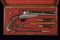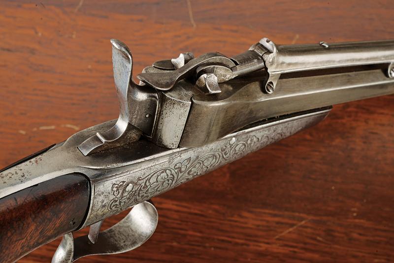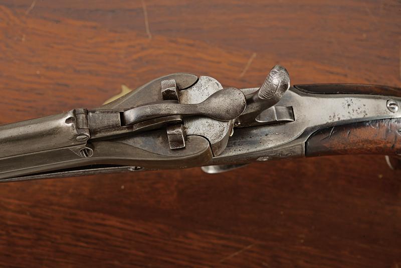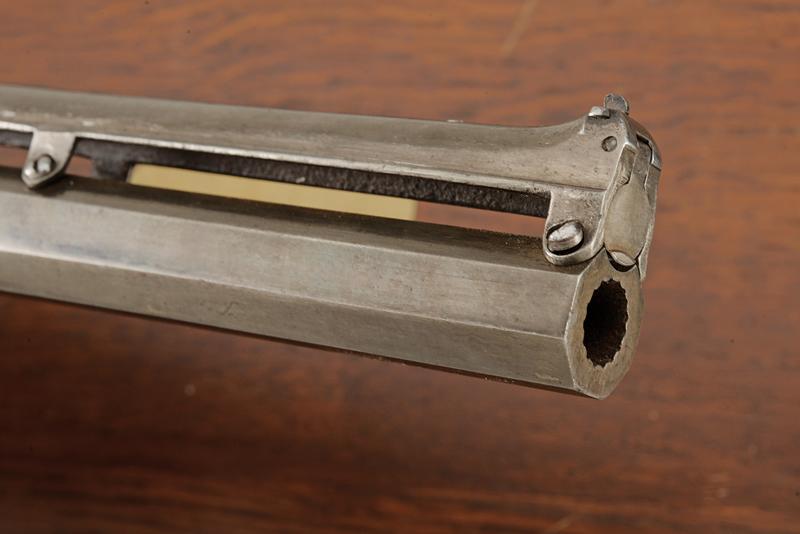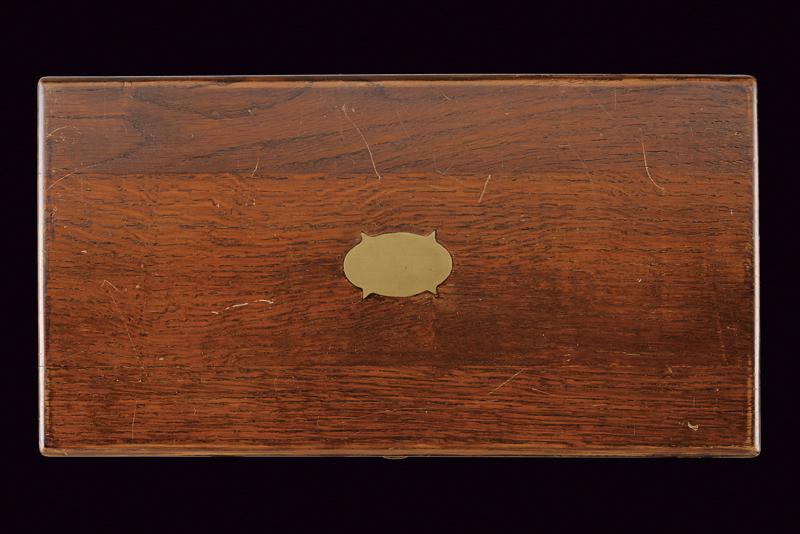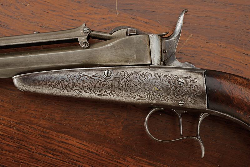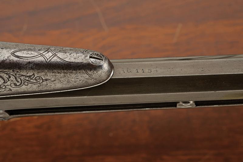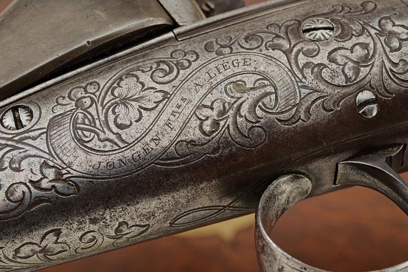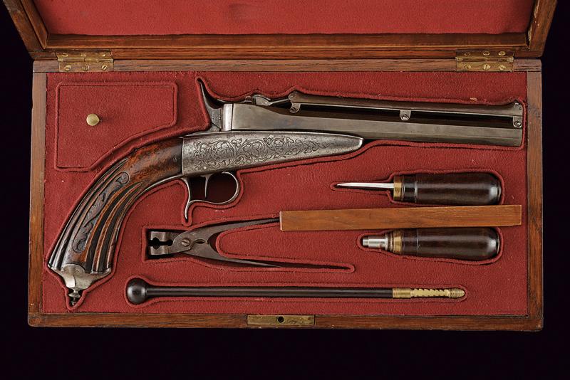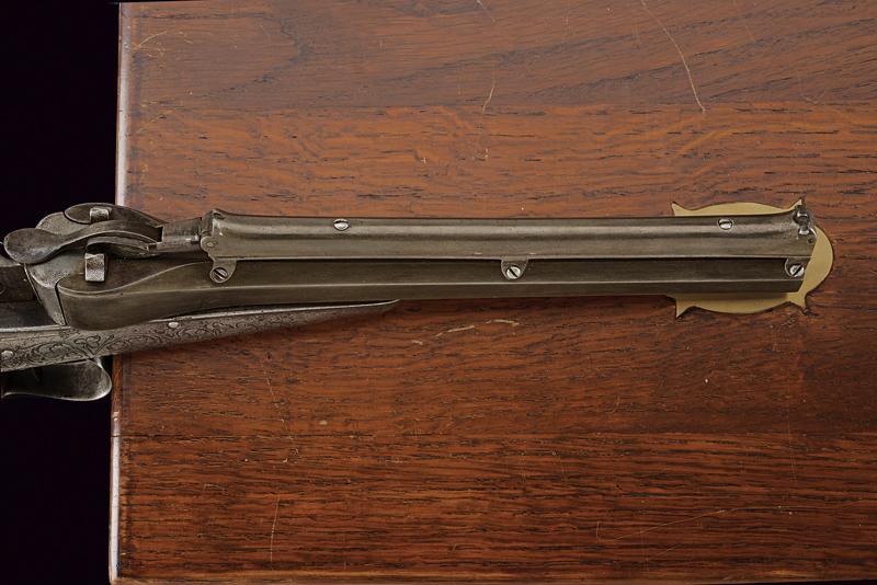 Rara pistola Collette a gravità di Jongen Freres, in cassetta, datazione: Terzo quarto del XIX Secolo provenienza: Belgio, Canna ottagonale, rigata, con serbatoio a gravità, cal. 10 mm. Castello in acciaio finemente inciso a racemi e con cartiglio 'JONGEN FRERES A LIEGE'. Calcio in legno scanalato e intagliato, ponticello inciso e munito di poggiadito, coccia in ferro. In una cassetta in legno (rifoderata all'interno) munita di alcuni strumenti e di chiave. lunghezza 37,5 cm.