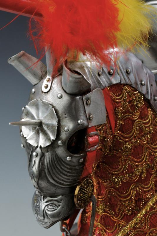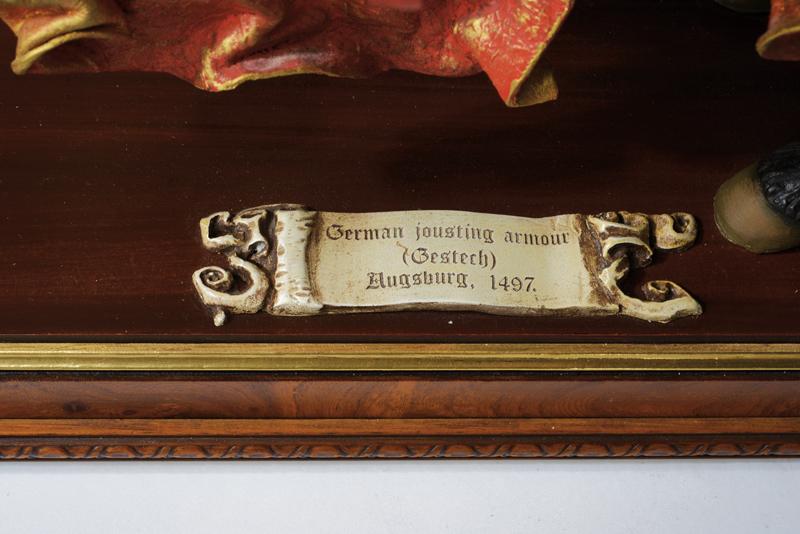 Bellissimo modello di un cavaliere alla giostra, datazione: ultimo quarto del XX Sec. provenienza: Inghilterra, Notevole gruppo, maestosamente eseguito, di un cavaliere in armatura gotica, sullo stile della fine del XV secolo, completo della cavalcatura. Minuziosamente lavorato fino al più piccolo dettaglio, completo di lancia e scudo. Su piedistallo ligneo con bandeau recante l'iscrizione 'German jousting armour (Gestech) Augsburg 1497'. altezza 53 cm.