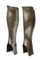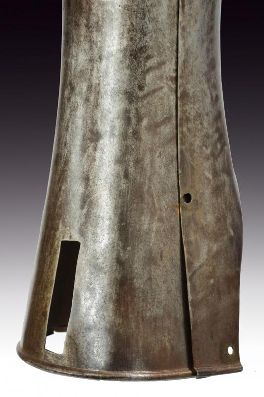 Paio di schinieri, datazione: XIX Secolo provenienza: Italia, in ferro completi di cerniere a scatto e galletti per l'attacco dei cosciali, talloni con fessure rettangolari per il passaggio degli sproni, orlo posteriore cordonato. Ben modellati. altezza 48 cm.