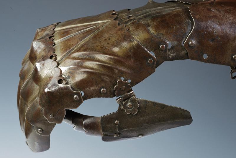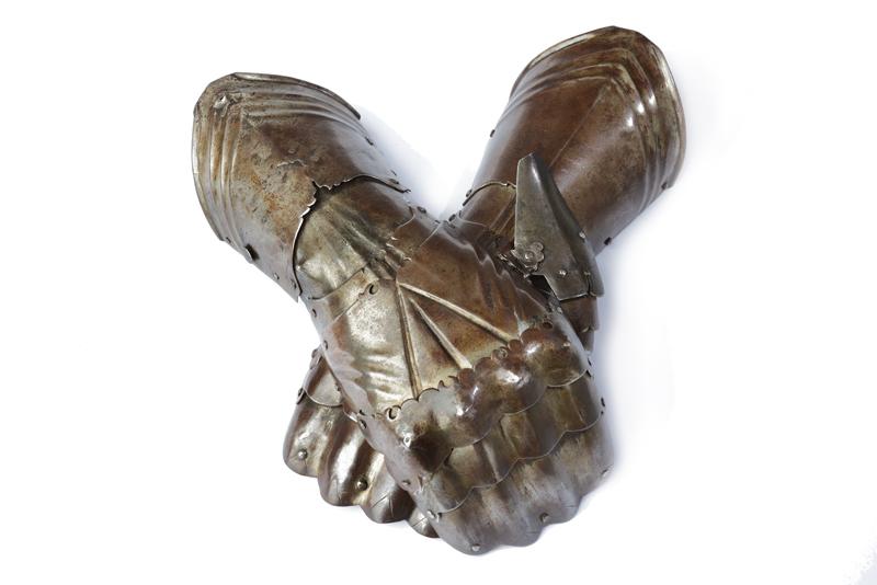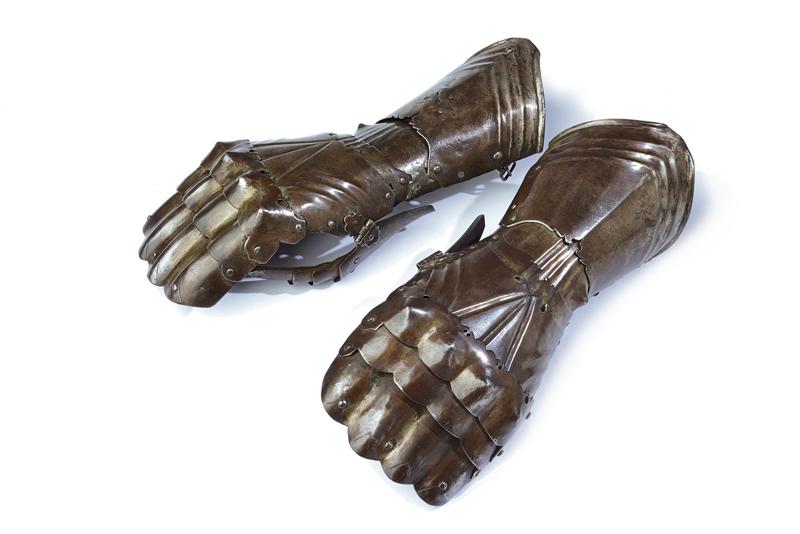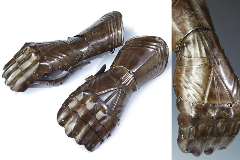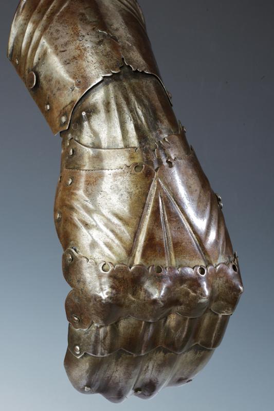 Raro paio di manopole gotiche , datazione: 1480 / 1860 provenienza: Germania, Una manopola originale del 1480 martellato a mano e con i tipici intagli dell'epoca, un restauro sul dorso. La manopola sinistra lavorato nel XIX secolo per completare il paio, probabilmente per una armatura gotica. lunghezza 28.5 cm.