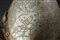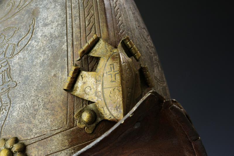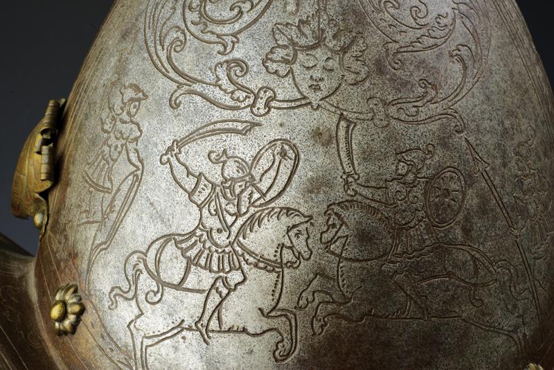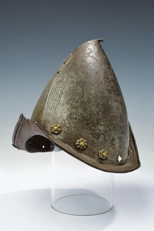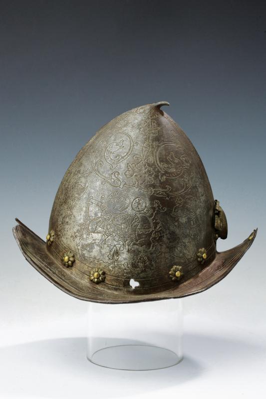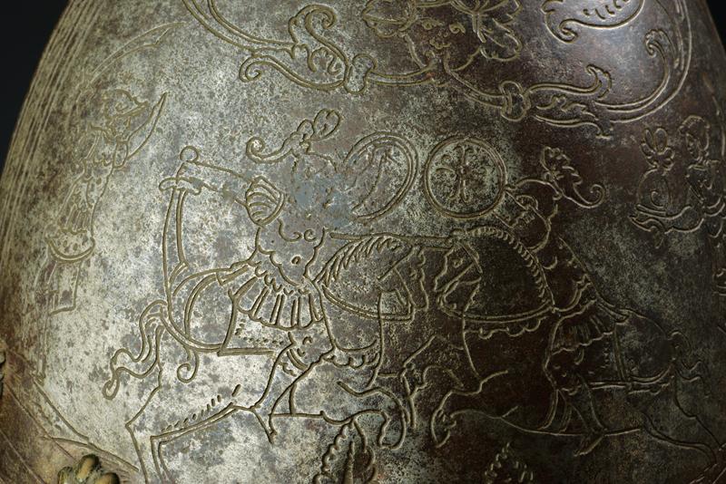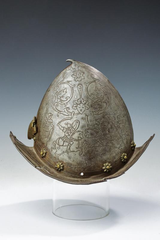 Morione inciso, datazione: 1600 circa provenienza: Italia, Coppo in ferro battuto in un solo pezzo, costolato in mezzeria, con apice aguzzo e volto all'indietro. Tesa a barchetta con danni e mancanze, la superficie incisa con guerrieri all'antica in combattimento su cavallo, soldati a piedi, mascherone, serpenti e motivi floreali. Pennacchiera in ottone, giro di rivetti (due mancano). In patina. Da pulire. altezza 24 cm.
