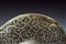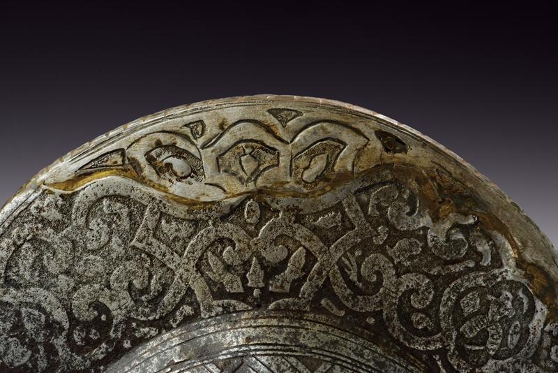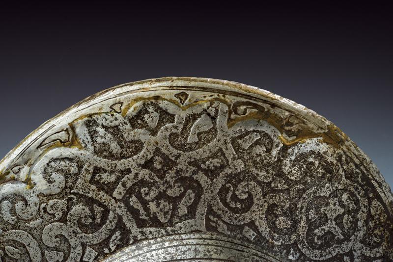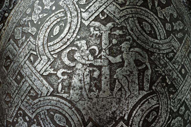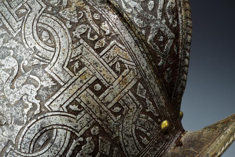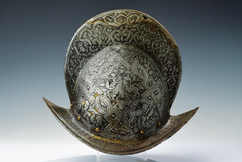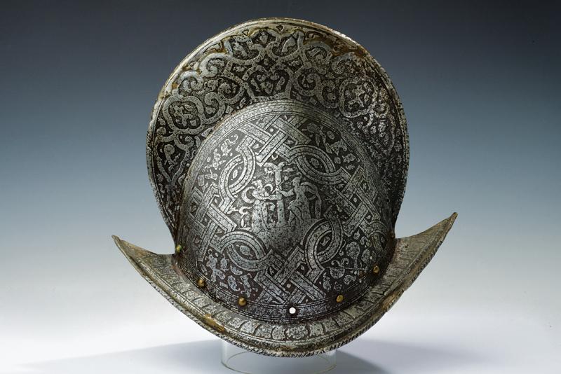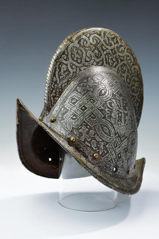 Bel morione tondo inciso, datazione: ultimo quarto del XVI Sec. provenienza: Italia, Coppo in un unico pezzo con alta cresta (riparata al sommo), giro di ribattini in ottone e ferro (alcuni di restauro); tesa a barchetta con bordo ribadito e cordonato; la cresta ornata a bande e trofei come la supeficie del coppo, con scene mitologiche circondate da bande ad intreccio e trofei. Vari piccoli restauri. Vedi simili elmi e decorazioni nella collezione Odescalchi, Venezia. altezza 32 cm.