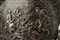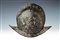 Bel morione sbalzato, datazione: fine del XVI Sec. provenienza: Italia settentrionale, Coppo in ferro lavorato in un unico pezzo con cresta di media altezza e tesa a barchetta, bordi a fingere il tortiglione (piccoli difetti e mancanze); in basso un giro di ribattini (la maggior parte mancanti). Tutta la superficie con maestosi bassorilievi: su un fianco un combattimento fra cavalieri in campo aperto incorniciato da maschere grottesche e bande decorative, sull'altro un gruppo di guerrieri a cavallo in ritirata attraversa un fiume, anche questa scena incorniciata come la precendte; la cresta mostra i ritratti di un uomo e una donna, ed anche animali e mascheroni, la tesa decorata con mascheroni ed animali mitologici tra disegni floreali. Gli elmi sbalzati si trovano raramente sul mercato internazionale. Vedi una piccola serie di elmi italiani sbalzati in 'Europäische Helme' di Müller/Kunter, numeri 69-72, 112, 119 e 121. altezza 23 cm.