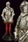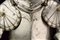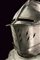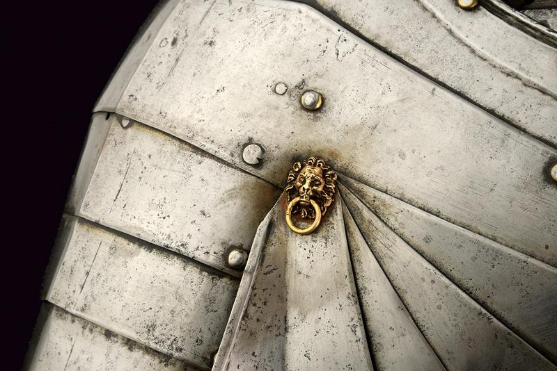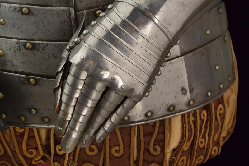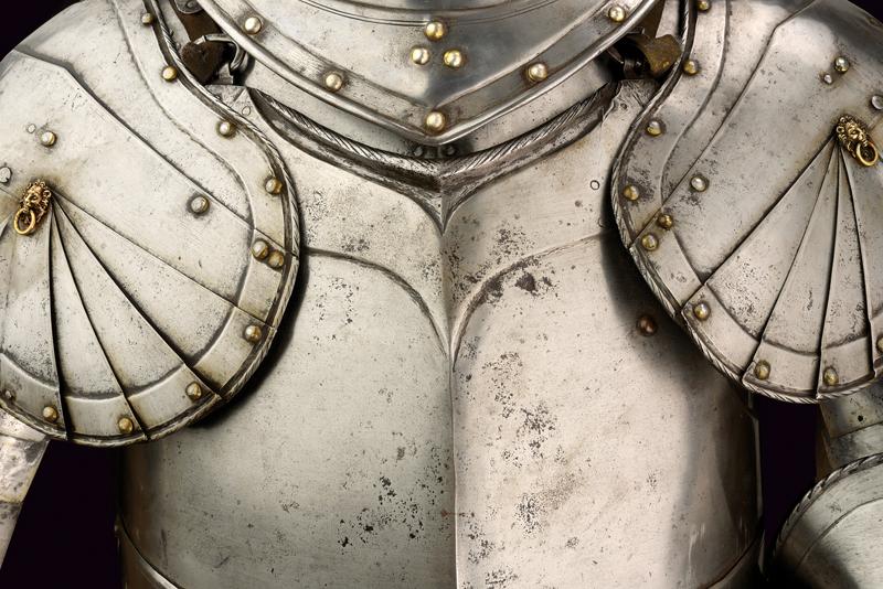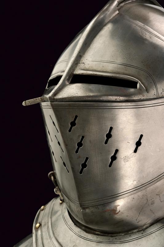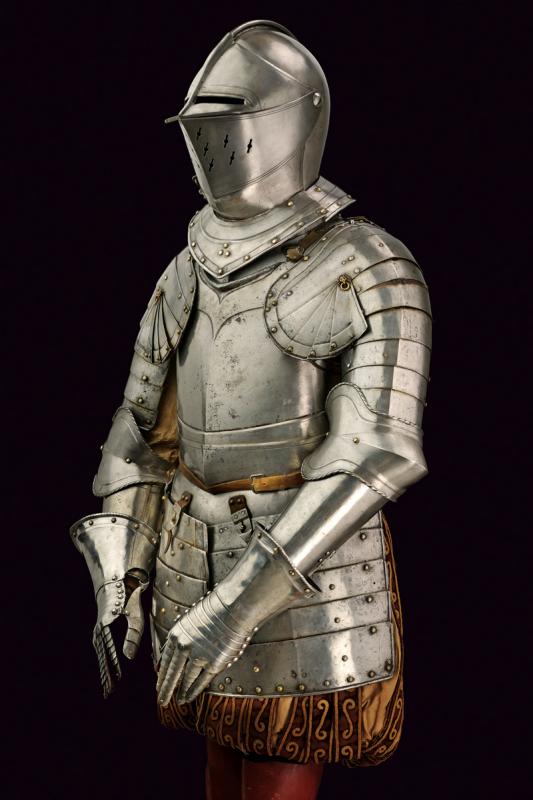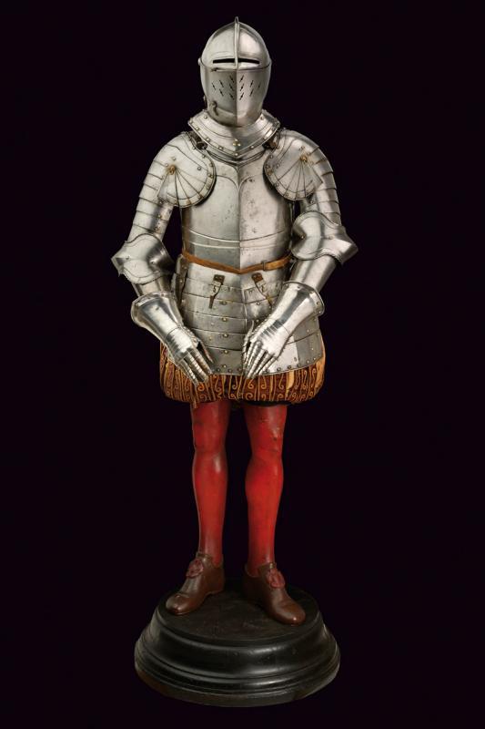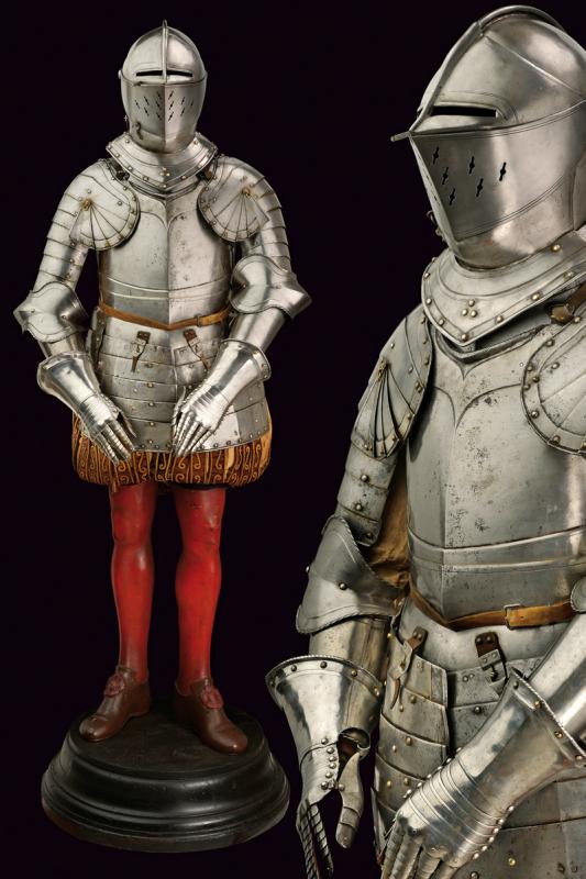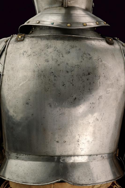 Corsaletto da uomo d'arme, datazione: inizio del XVII Sec. provenienza: Svizzera, Elmetto con coppo lavorato in due metà congiunte alla bassa cresta. Vista rialzabile con fessure oculari e decoro a doppie delineature, munita di manopola di sollevamento. La ventaglia probabilmente più tarda, dotata di fori aeratori. Gronda e guardacollo a lama singola, con margini a lista ribassata, doppie delineature e cordone liscio. Vari ribattini più tardi. Gola con falde a tre lame, lo scollo con cordone inciso a fingere il tortiglione. Petto costolato in mezzeria, con guardascella e scollo recanti spessi cordoni incisi a tortiglione. Robusta panziera a due lame con delineatura singola. Le scarselle con tracce di bande incise e cordoni lisci, entrambe con antica riparazione realizzata in tempo d'uso. Spallacci alla svizzera, ali a lamelle sventagliate incardinate a un fornimento lavorato a testa di leone in ottone recante di anello fra le fauci. Il dorso delle lame con tracce di banda incisa al centro come le scarselle. Manopole con dita a scaglie complete , delineature singole e manichini con cordoni incisi a tortiglioni come le cubitiere. Schiena liscia. Presentata su un bel manichino espositivo, probabilmente d'inizio '900 completo di piedistallo, lavorato in vesti corrette rispetto all'epoca dell'armatura, realizzate parzialmente in tessuto e parzialmente in legno. Altezza corsaletto circa 101 cm. Elegante armatura coeva, con elmo non originario ma antico e della giusta tipologia. Di grande impatto visivo. altezza total with base 189 cm.