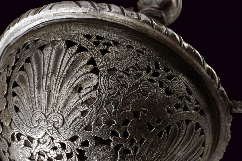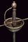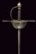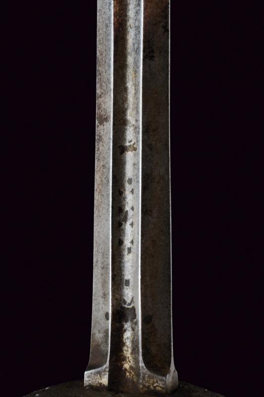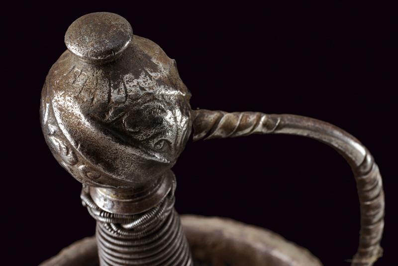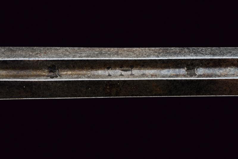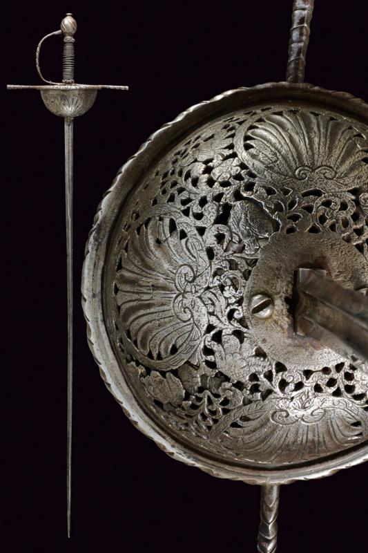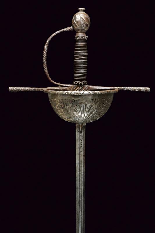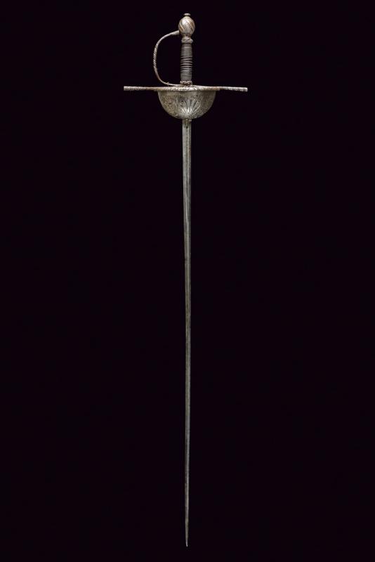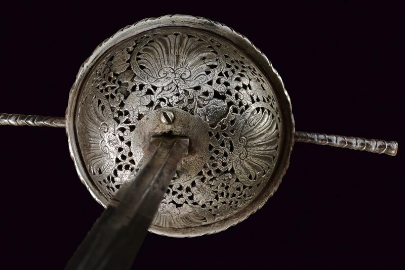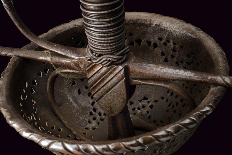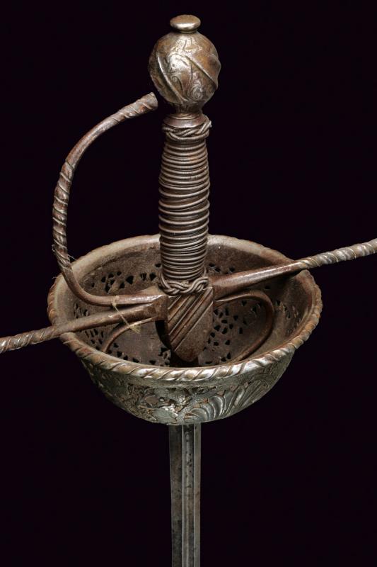 Spada a tazza, datazione: fine del XVII Sec. provenienza: Italia, Lunga lama dritta, robusta a due fili, di sezione a losanga, con breve scanalatura al forte recante resti di iscrizioni su entrambi i lati; fornimento in ferro, la tazza emisferica, incisa e traforata a motivi floreali, il bordo alzato e lavorato a fingere il tortiglione, elso dritto a bracci lunghi, intagliati a spire e crescente verso l'esterno, il ramo di guardia lavorato en suite. Massello intagliato a scudetto con scanalature oblique nella parte superiore. Pomo ovale intagliato a bande oblique e motivi floreali. Impugnatura in legno rivestito di trecciola (mancanze) e teste di moro in filo di ferro. lunghezza 124 cm.