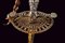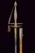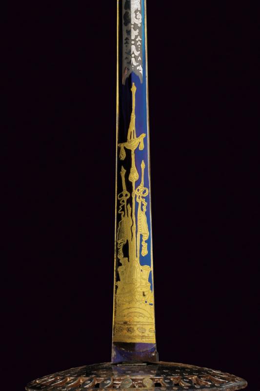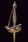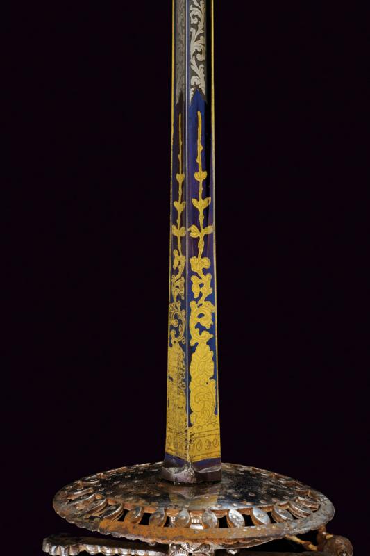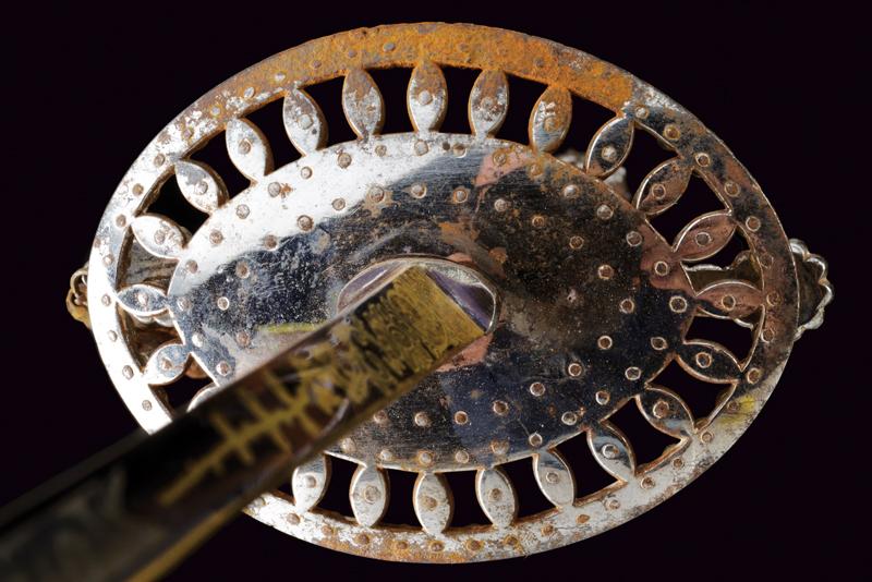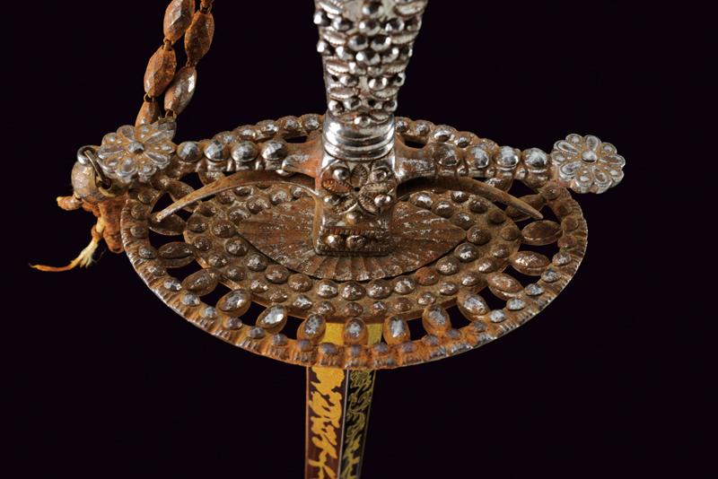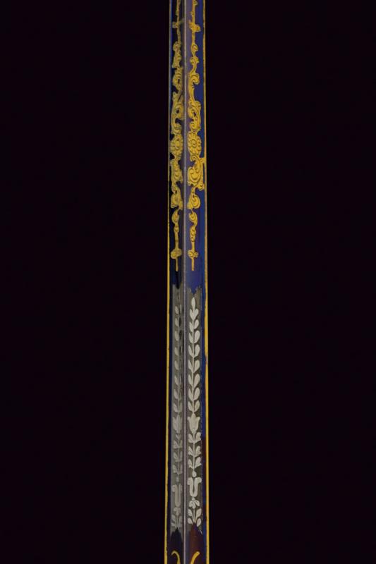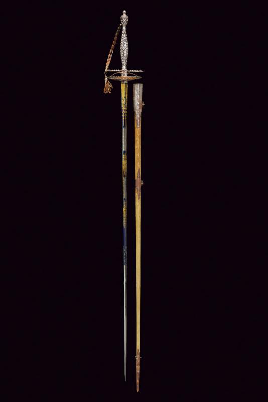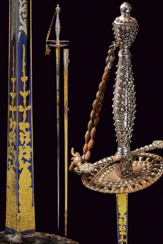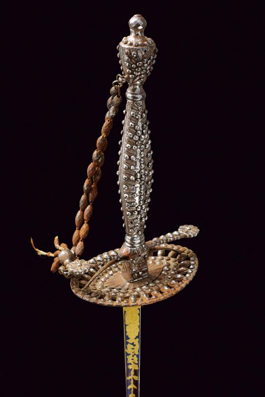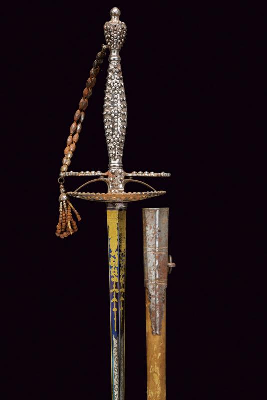 Bello spadino con fodero, datazione: primo quarto del XIX Sec. provenienza: Inghilterra, Bellissima lama di sezione triangolare decorato con incisioni dorate su fondo blu a trofei e motivi floreali in perfette condizioni protetto dal fodero. Fornimento in acciaio decorato a perline, catenella e pendenti con ruggine superficiale, piccole mancanze. Completo del raro fodero in legno rivestito di pelle chiara con fornimenti in ferro inciso con fiori stilizzati en suite con il massello. Zone di ruggine superficiale leggermente rimovibile. Due anelli di sospensione. lunghezza 100.5 cm.