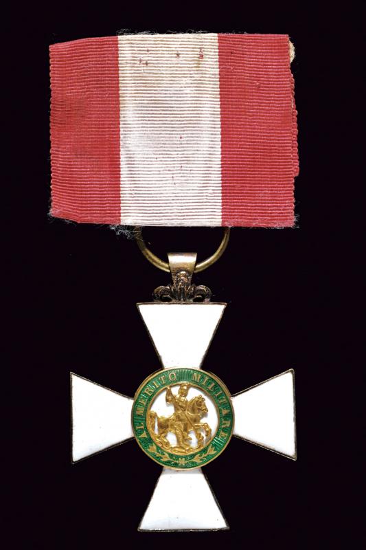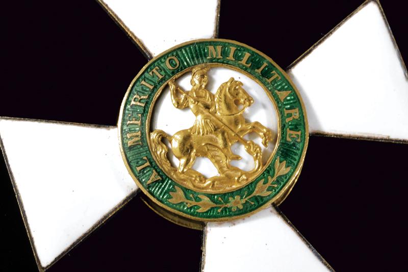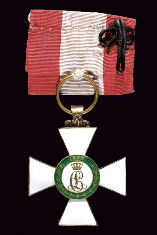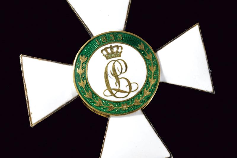 Ordine di San Giorgio al Merito Militare, datazione: Secondo quarto del XIX Secolo provenienza: Ducato di Lucca, Croce di cavaliere in argento dorato e smaltato. Su nastro originale e in astuccio marcato 'F. C.' in oro. dimensioni 3.8 x 3.8 cm.