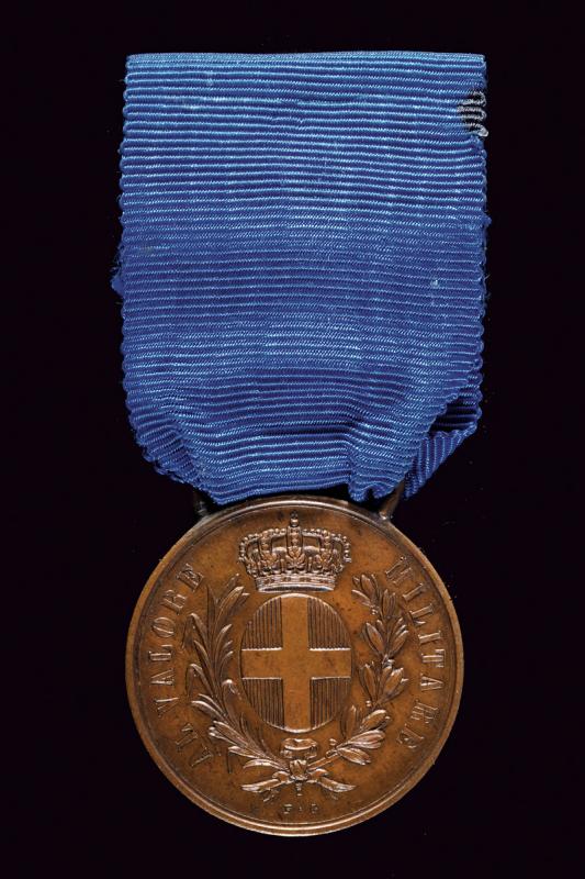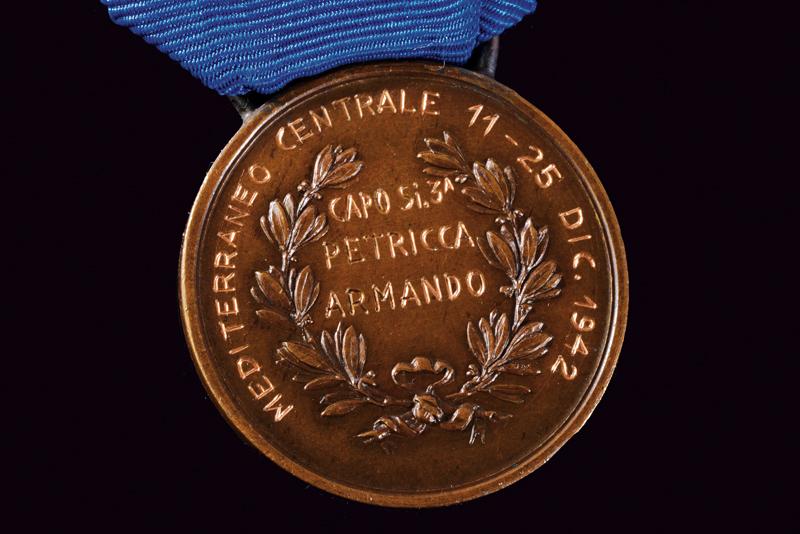 Medaglia al Valore Militare in bronzo, datazione: 1942 provenienza: Regno d'Italia, Iscrizione ' MEDITERRANEO CENTRALE 11 - 25 DIC. 1942 / CAPO SI 3A PERTICCA ARMANDO'. Su nastro. diametro 3.3 cm.