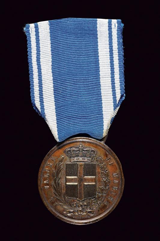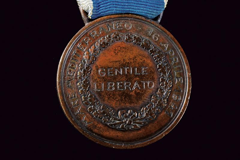 Medaglia al Valore di Marina in bronzo, datazione: 1941 provenienza: Regno d'Italia, Iscrizione 'MARE MEDITERRANEO 16 APRILE 1941'. Marcato 'FERRARIS'. Su nastro. diametro 3.3 cm.
