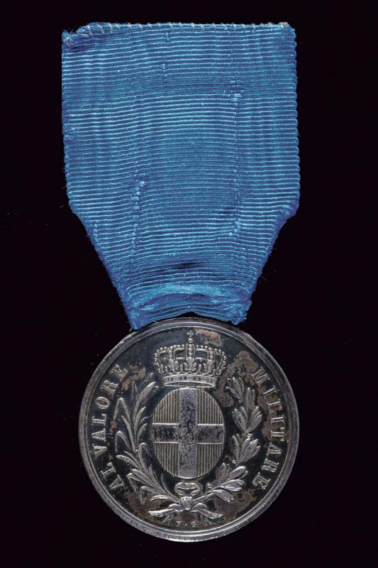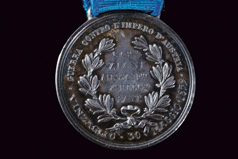 Medaglia al Valore Militare in argento, datazione: 1859 provenienza: Regno di Sardegna, Iscrizione 'VINZAGLIO 30 MAGGIO 1859 - GUERRA CONTRO L'IMPERO D'AUSTRIA / CAP.NO ZIANI ALESSANDRO 8 REGG.TO FANT'. Marcato 'FG'. Su nastro. In astuccio. diametro 3.3 cm.