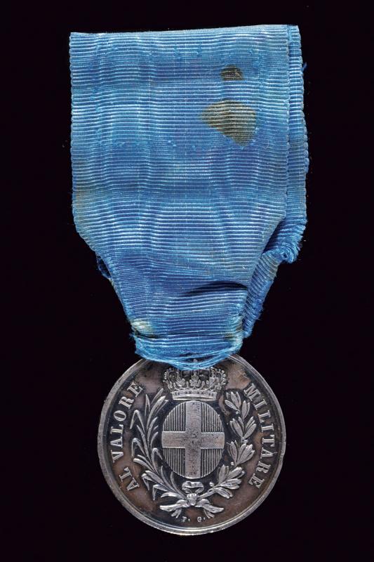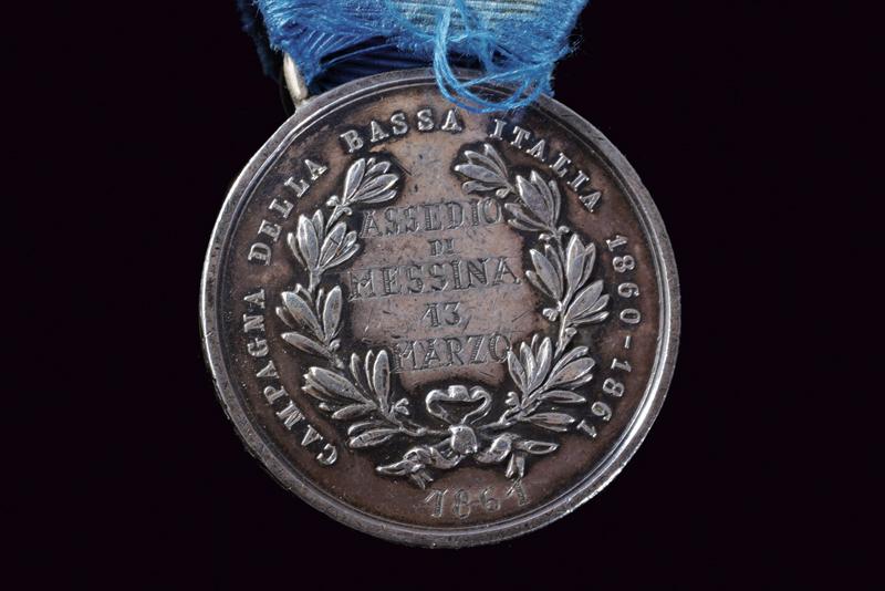 Medaglia al Valore Militare in argento, datazione: 1861 provenienza: Regno di Sardegna, Iscrizione 'CAMPAGNA DELLA BASSA ITALIA 1860-1861 / ASSEDIO DI MESSINA 1861'. il bordo marcato 'ANGOLO DONI 35° REGG.TO FANT.A'. Marcato 'FG'. Su nastro (molto vissuto). In astuccio. diametro 3.3 cm.