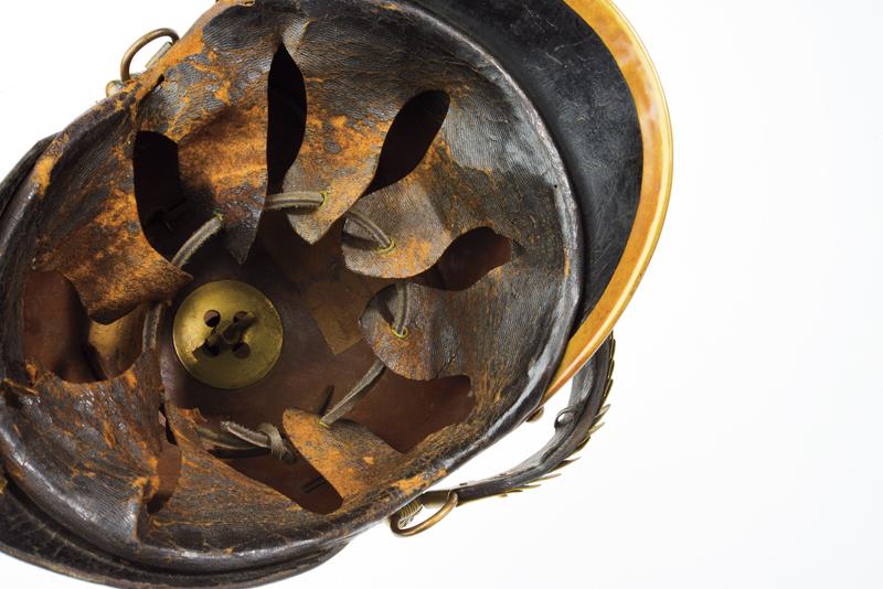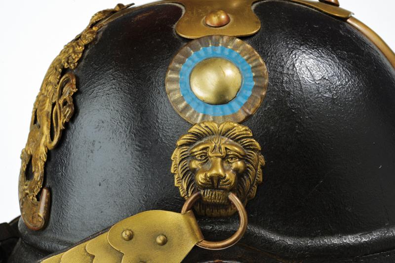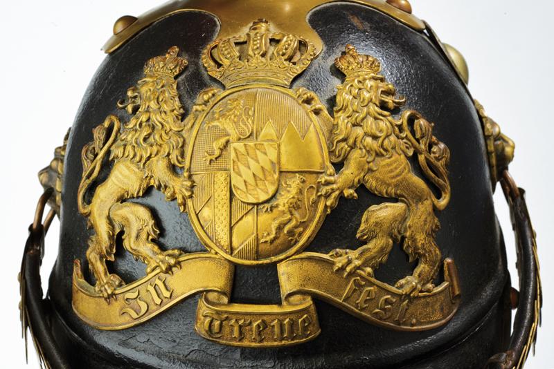 Pickelhaube da Gendarmeria, datazione: 1880 circa provenienza: Baviera, Coppo e visiere in cuoio bollito, fornimenti regolamentari in ottone, interno in cuoio a spicchi. altezza 26 cm.