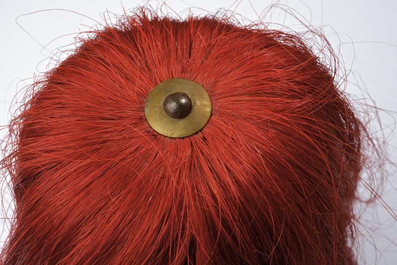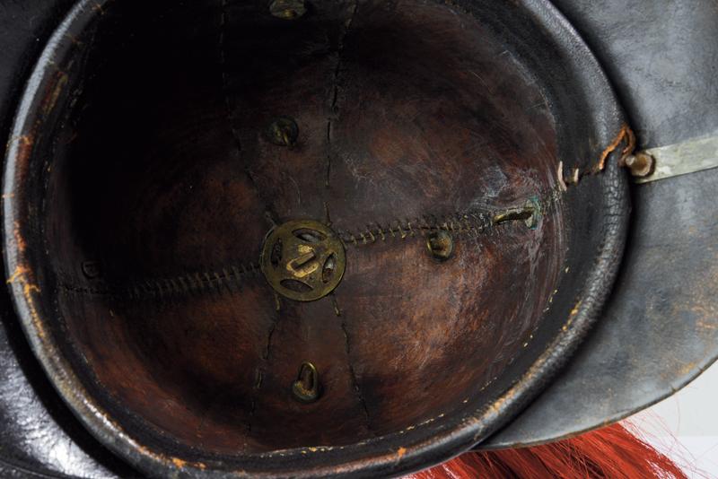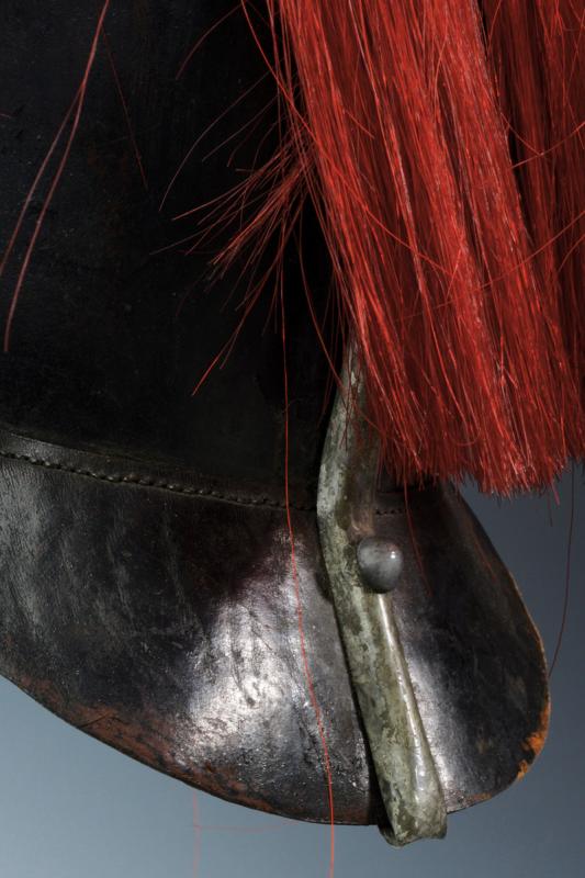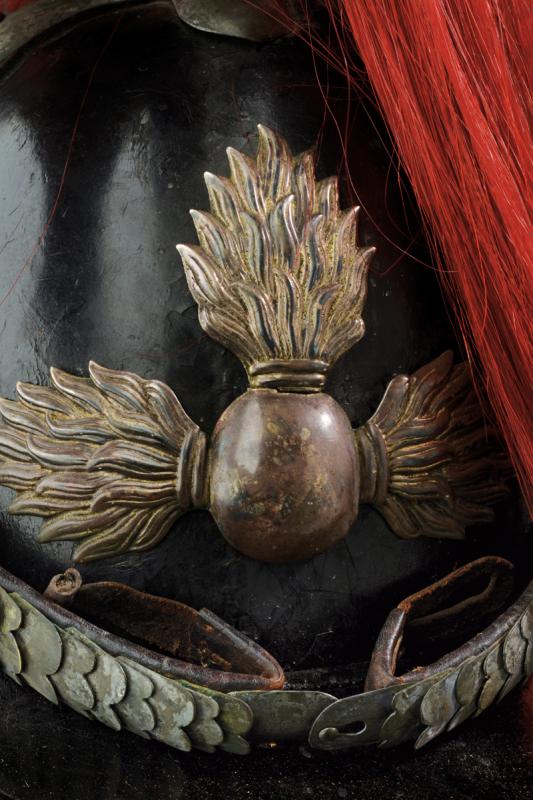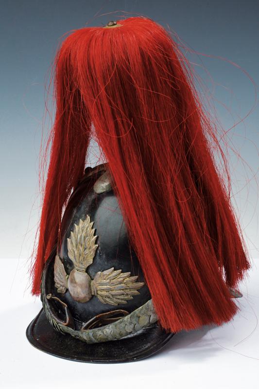 Raro elmo 1844 da Musicante di Fanteria di Guarnigione, datazione: 1853 - 1856 provenienza: Russia imperiale, Coppo in cuoio bollito, fornimenti in metallo bianco stagnato, fregio frontale con granata a tre fiamme, puntale con crine rosso, interno con alluda in pelle, coccarda dipinta con i colori imperiali. Una squama del sottogola mancante. Bibliografia: Massimiliano Angelini, 1991, 'Militaria in Europa', Rivista Militare Europea, pag. 108 illustrato. altezza 36 cm.
