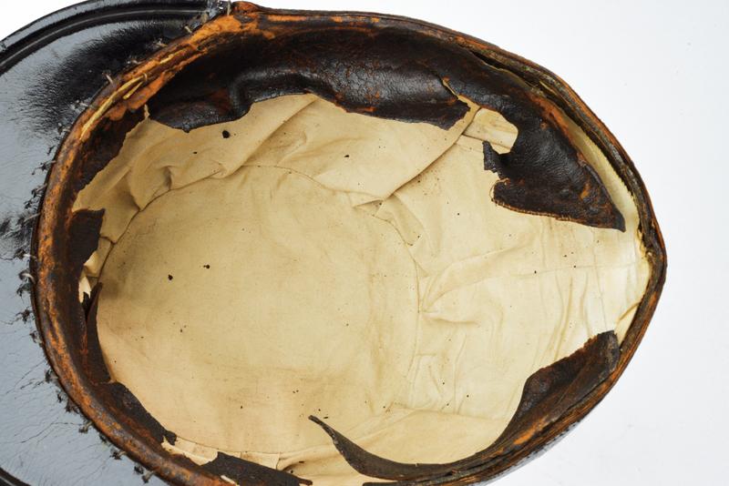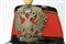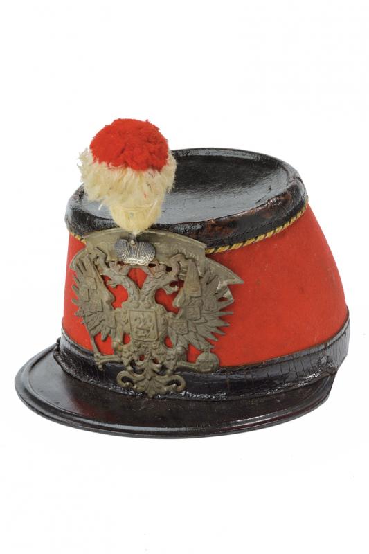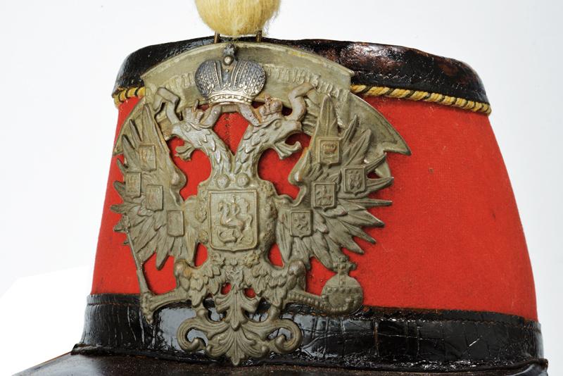 Kepi da truppa mod. 1872, datazione: Fine del XIX Secolo provenienza: Russia imperiale, Corpo rivestito in panno color ciliegia, per la truppa di un reggimento di ussari. Nappina di pertinenza, bel fregio metallico con aquila bicipite coronata sotto cartiglio. Interno in seta bianca, alluda con mancanze per l'uso. La corona del fregio restaurata. Bibliografia: Massimiliano Angelini, 1991, 'Militaria in Europa', Rivista Militare Europea, pag. 110 illustrato. altezza 13 cm.