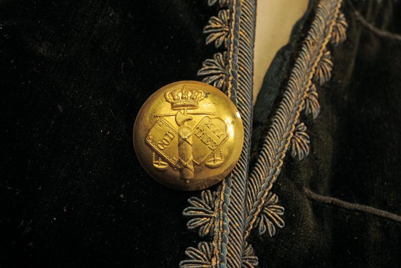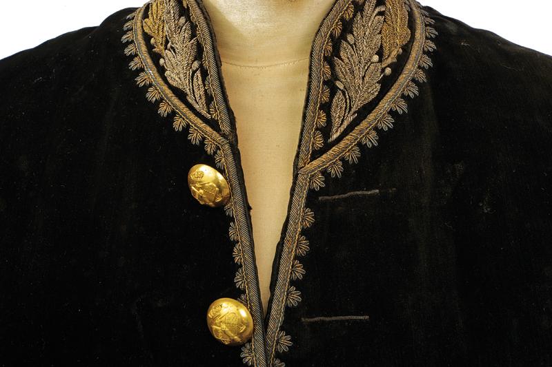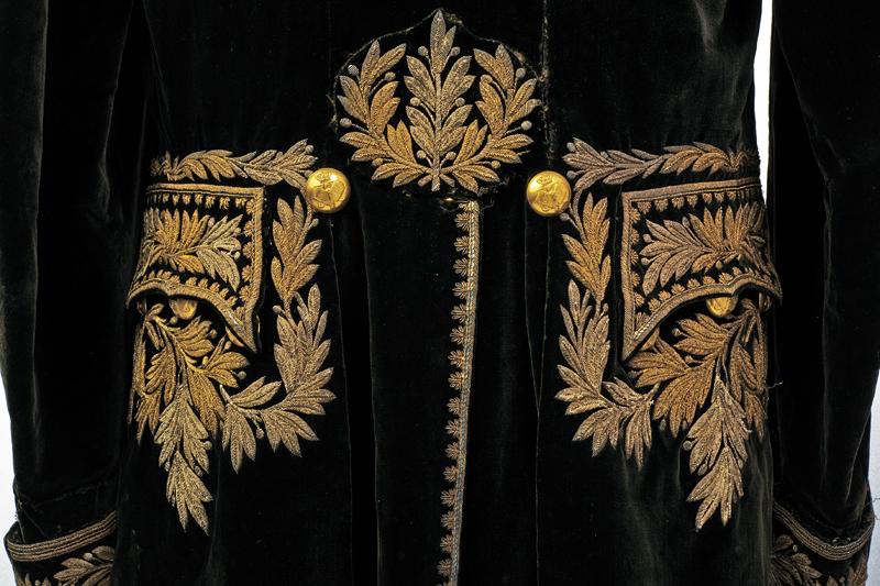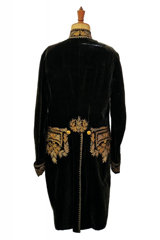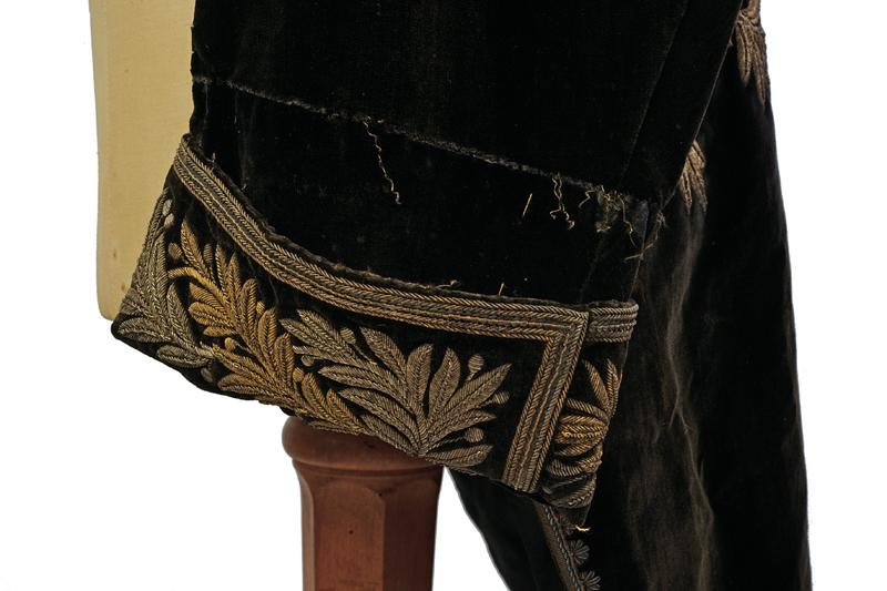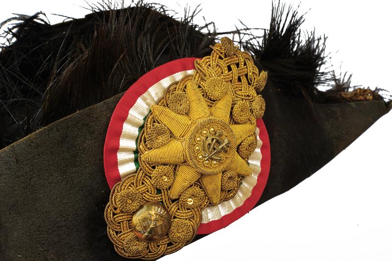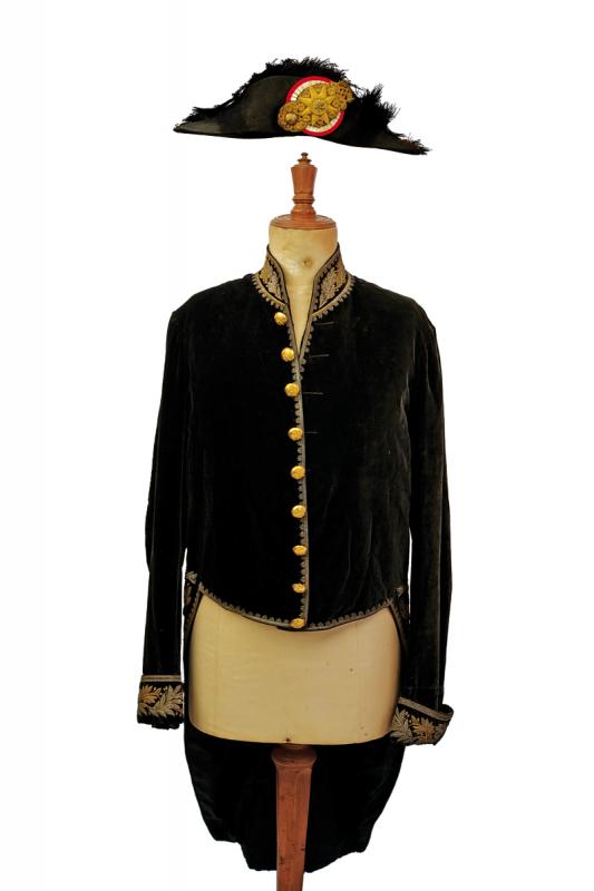Marsina e feluca da magistrato, datazione: 1880 - 1890 circa provenienza: Regno d'Italia, Riccamente confezionata in velluto nero per un alto magistrato con bei ricami dal caratteristico abbinamento argento-oro. Feluca con grande coccarda tricolore, cappio ricamato in canottiglia oro con il monogramma del re Vittorio Emanuele III, piumaggio nero e nappe dorate. altezza 115 cm.