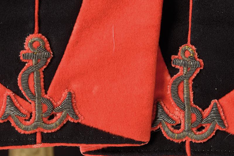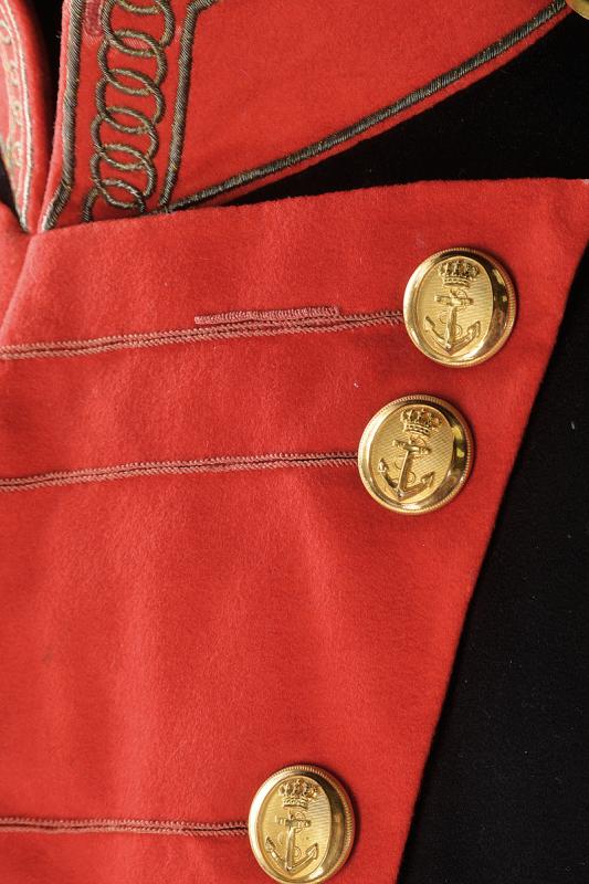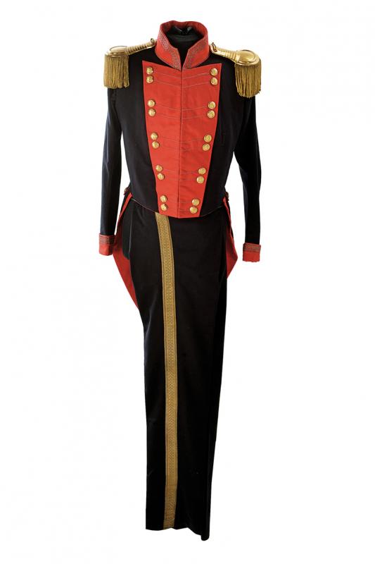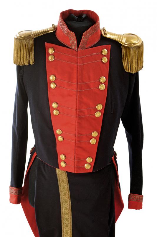 Uniforme da ufficiale dell'Ordine di Santo Stefano, Mod. 1840, datazione: secondo quarto del XIX Sec. provenienza: Granducato di Toscana, Uniforme ordinaria. Marsina in lana blu scuro con colletto, polsini, bordi e profilature in tessuto rosso; a colletto e polsini anche ricami in filo dorato. Fodera interna in seta nera. Bottoni dorati recanti ancora coronata. Completa di pantaloni in lana blu con gallone dorato. Insieme con un paio di spalline non pertinenti. altezza giacca circa 95 cm.
