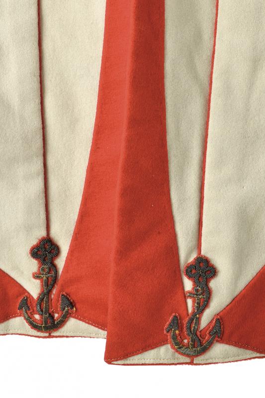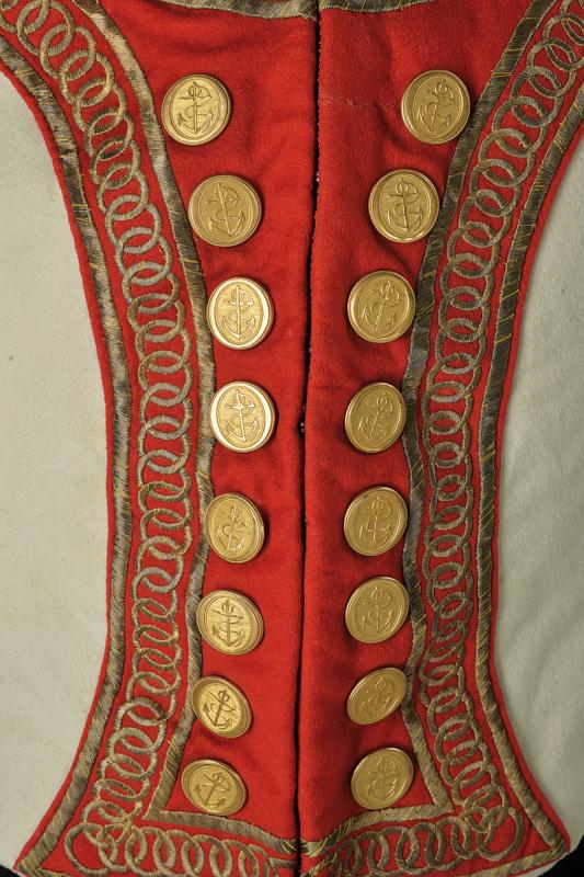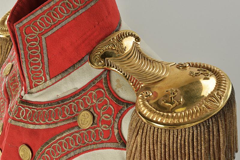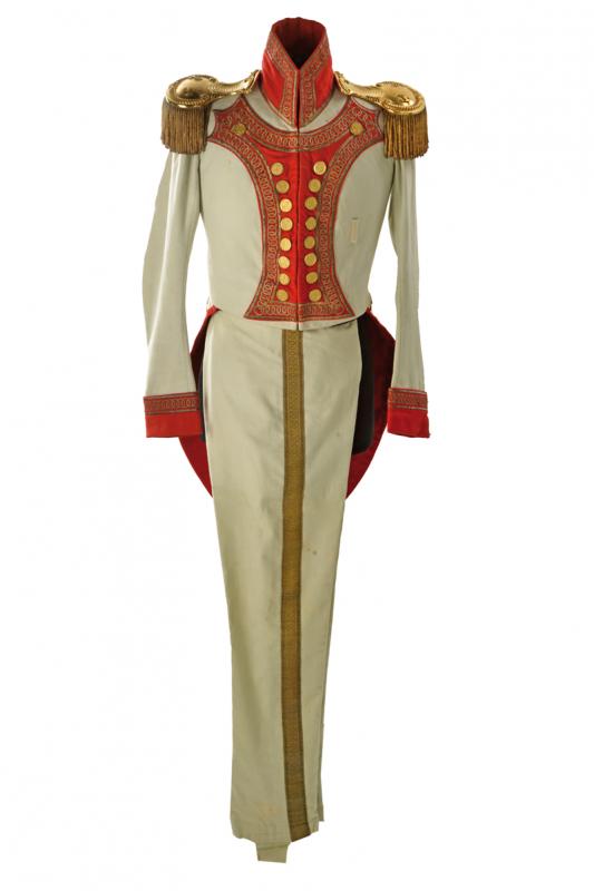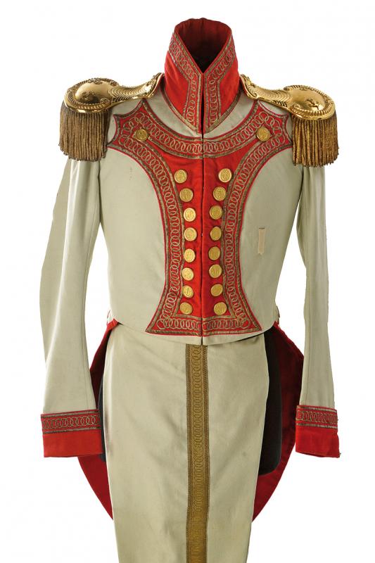 Uniforme da ufficiale dell'Ordine di Santo Stefano, Mod. 1840, datazione: secondo quarto del XIX Sec. provenienza: Granducato di Toscana, Grande uniforme. Marsina in lana bianca con bordi, colletto, polsini e profilature rossi, decorati in filo dorato con ricami a bande e catene. Bottoni dorati piatti recanti ancora. All'interno fodera in seta bianca. Completa di spalline metalliche recanti ancore e con frange in grovigliola. Pantaloni in lana bianca con gallone dorato. altezza giacca circa 100